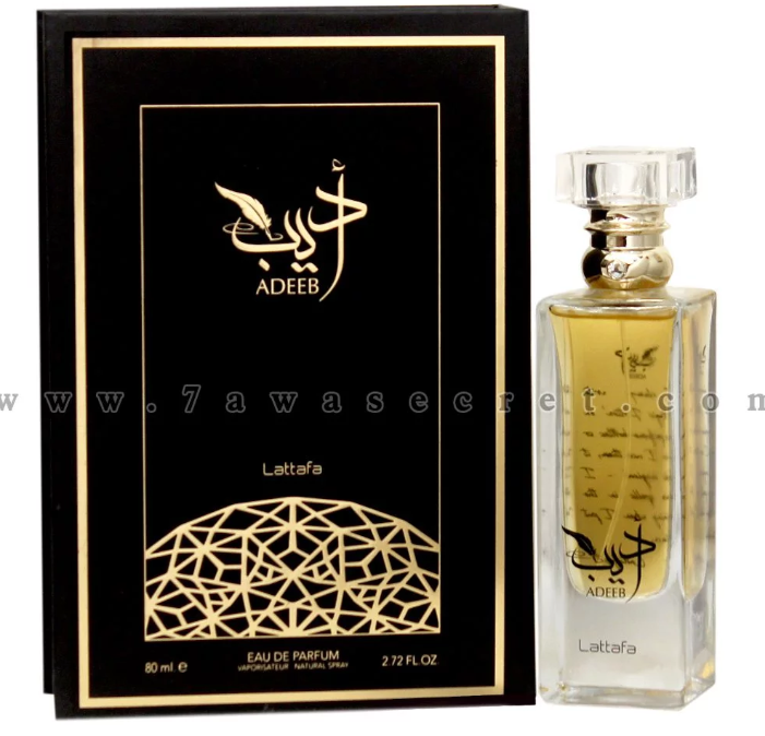 Adeeb Lattafa Perfumes عطر خشبي للجنسين. Adeeb صدر عام 2020. إفتتاحية العطر التبغ, القرفة و الفانيليا; قلب العطر الدخان, التوابل, الزعتر, العود, النوتات العشبية و القرنفل; قاعدة العطر تتكون من الباتشولي, المسك, خشب الأرز, خشب الصندل و العنبر الأسود.