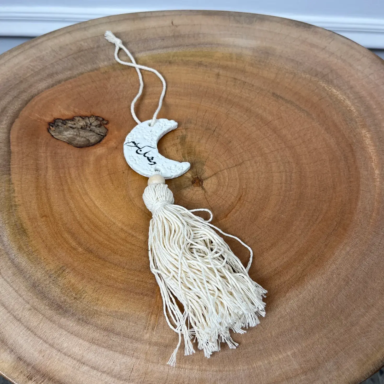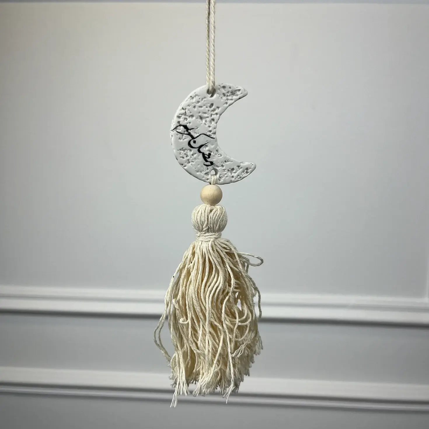 A delicate handmade hanging ornament featuring a textured crescent moon with subtle Arabic calligraphy, finished with a natural cotton tassel and wooden bead. Designed to add a soft spiritual touch to walls, doors, or shelves, this piece brings calm, minimal Ramadan charm into any space.