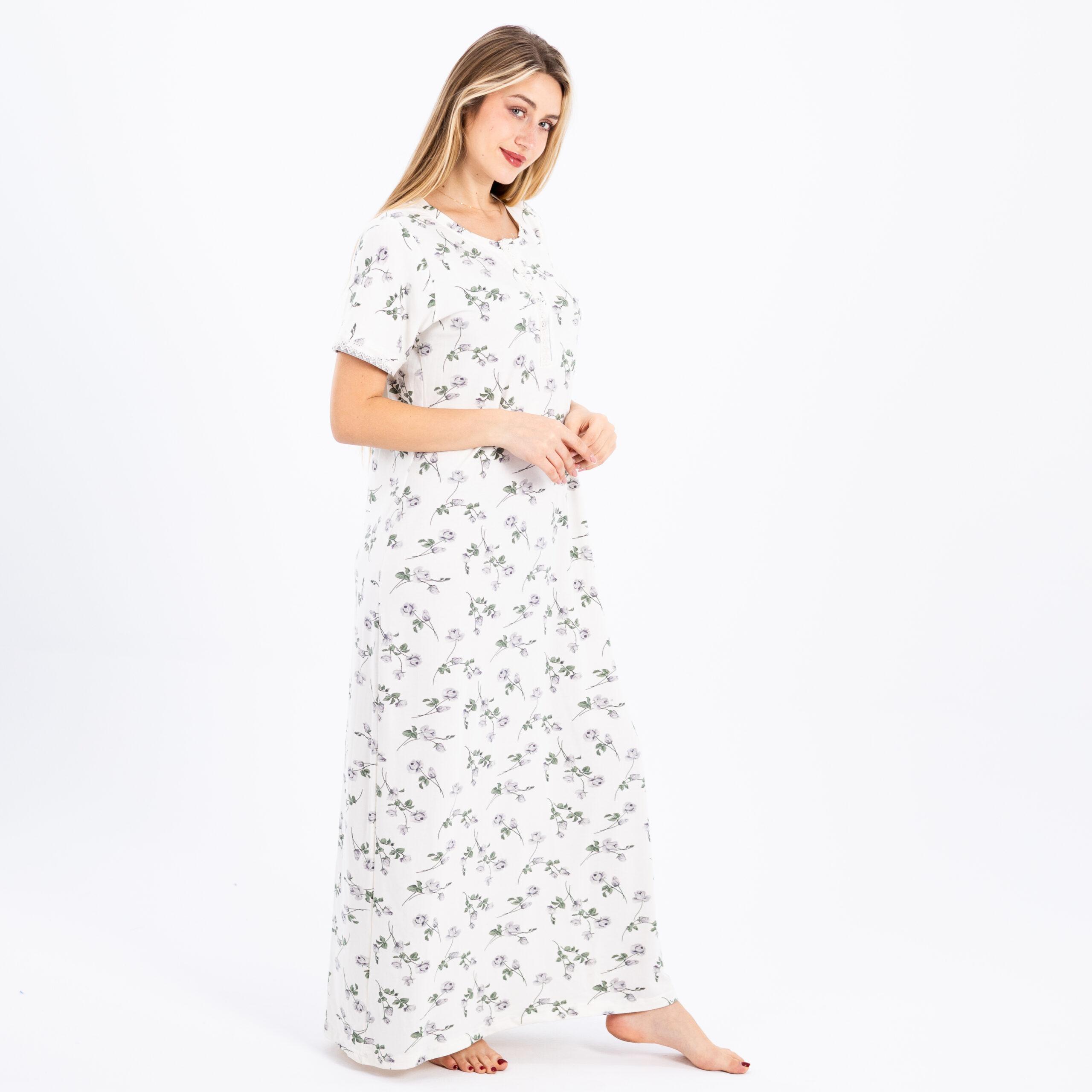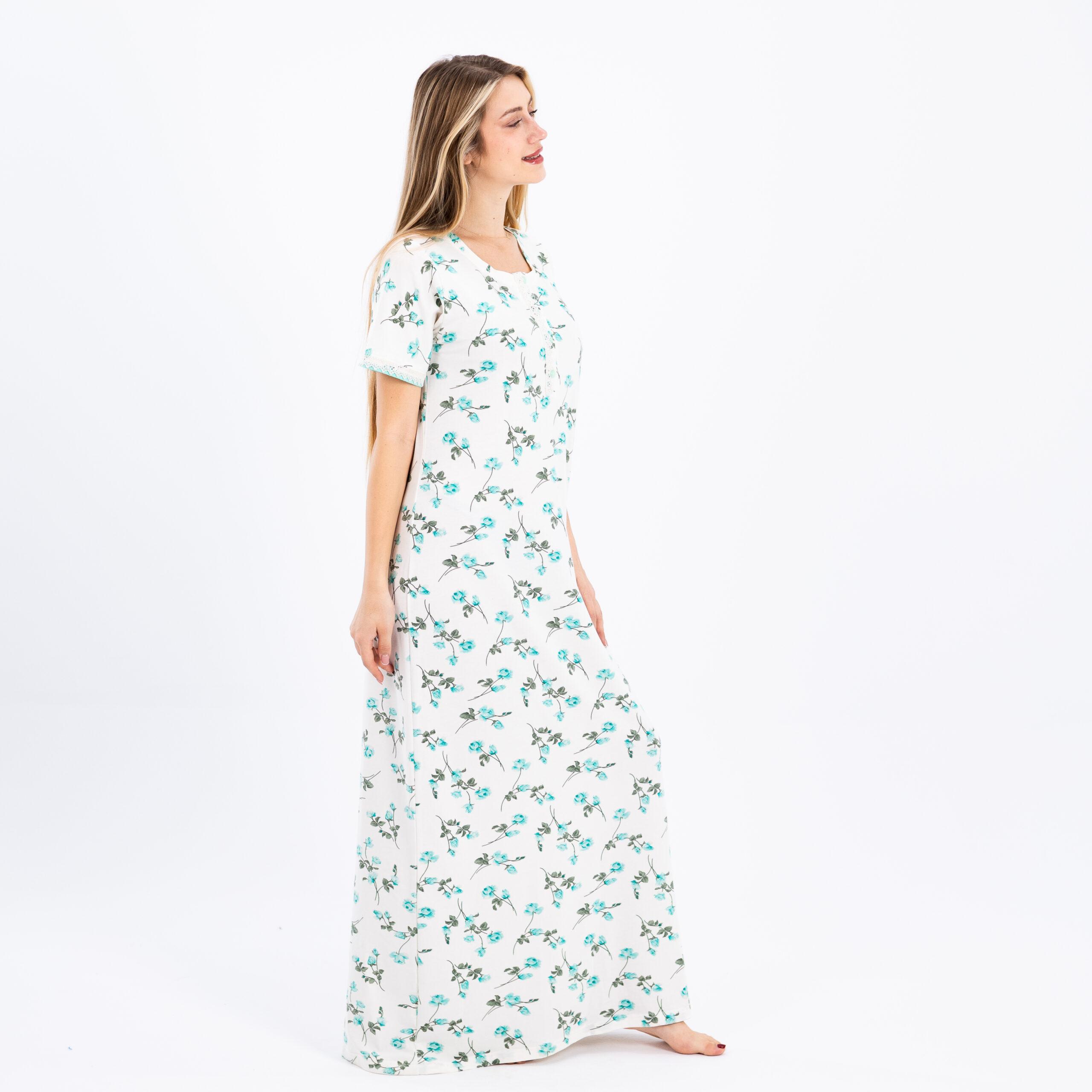 This elegant women’s nightgown features a pristine white fabric adorned with delicate green flowers, creating a serene and refreshing aesthetic. Crafted from soft, breathable material, it ensures a comfortable night’s sleep while adding a touch of sophistication to your nighttime wardrobe. The flattering design and gentle floral pattern make it perfect for lounging or a peaceful slumber, making it an essential addition to your collection. Embrace comfort and style with this charming nightgown that beautifully combines functionality with feminine grace.