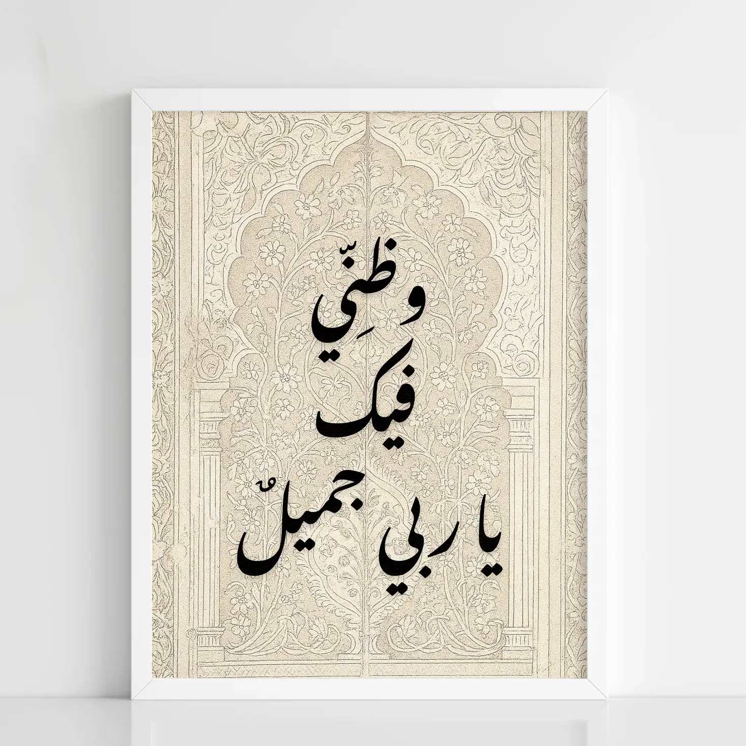 A beautifully framed Islamic calligraphy poster featuring the phrase “وَظَنِّي فِيكَ يَا رَبِّي جَمِيل” (My trust in You, my Lord, is beautiful). The artwork highlights elegant black Arabic calligraphy set against a soft, ornamental background inspired by classical Islamic design, creating a peaceful and spiritual atmosphere.