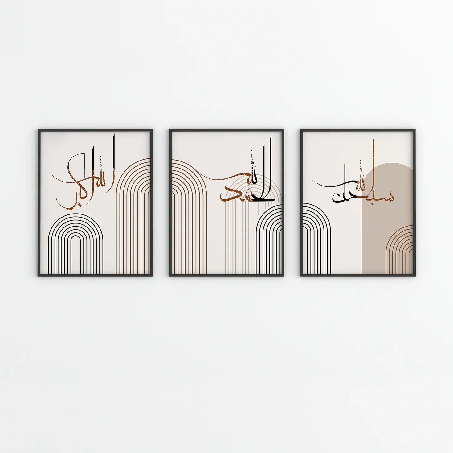 This elegant wall art set combines soft neutral tones with sleek geometric arches and refined Arabic calligraphy. The blend of warm beige, muted brown, and crisp black lines creates a calm, balanced look that elevates any living space.
