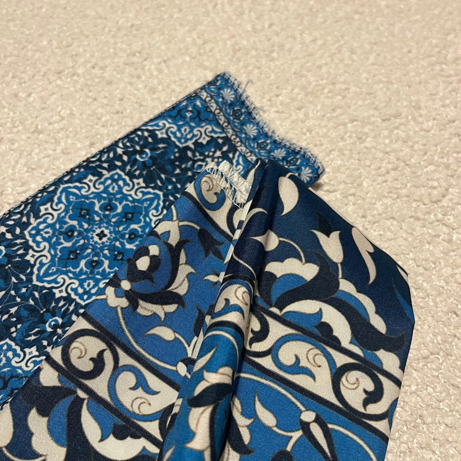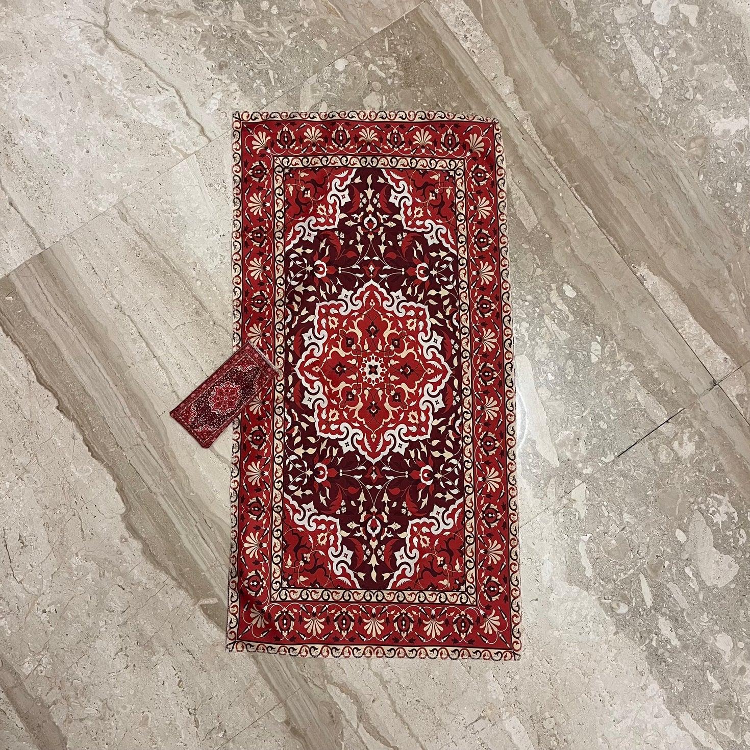 Compact polyester pocket prayer mat featuring a classic oriental motif. Lightweight, foldable, and easy to carry, making it ideal for travel, daily use, or keeping in a bag or car. The mat unfolds to a comfortable praying surface and folds neatly into its own pocket size. Durable polyester fabric ensures easy cleaning and long-lasting use. Available in multiple color variations as shown.