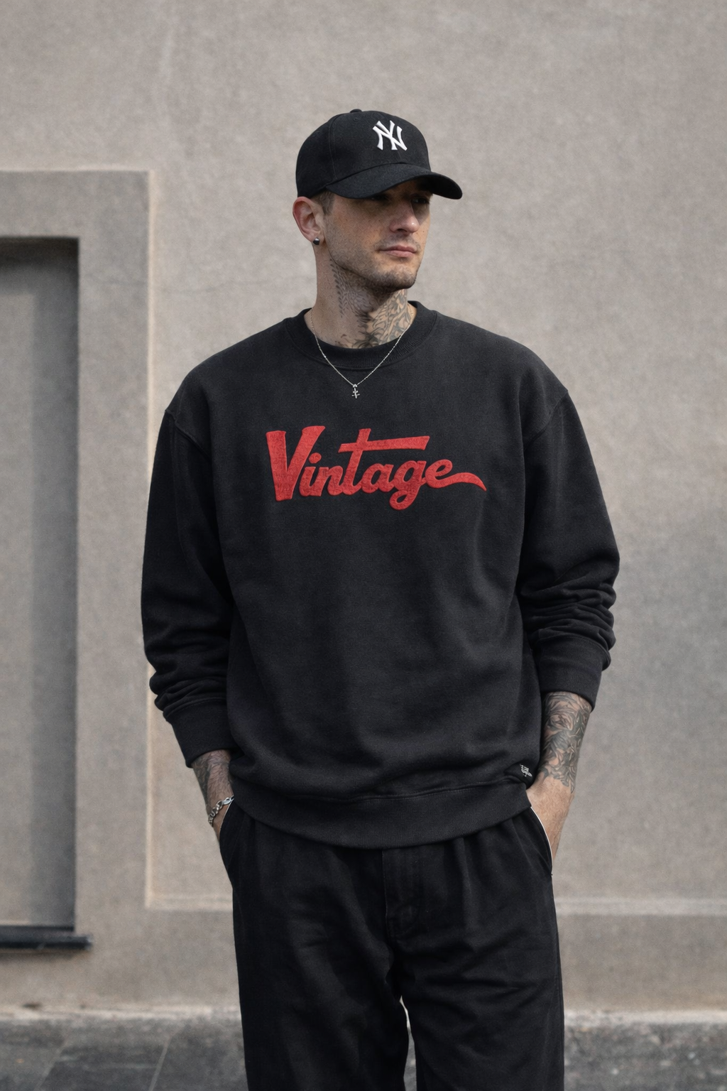 A heavyweight crewneck sweatshirt crafted from premium fleece, finished with bold red embroidered “Vintage” lettering. Designed with a relaxed, oversized fit for a clean, timeless streetwear look.