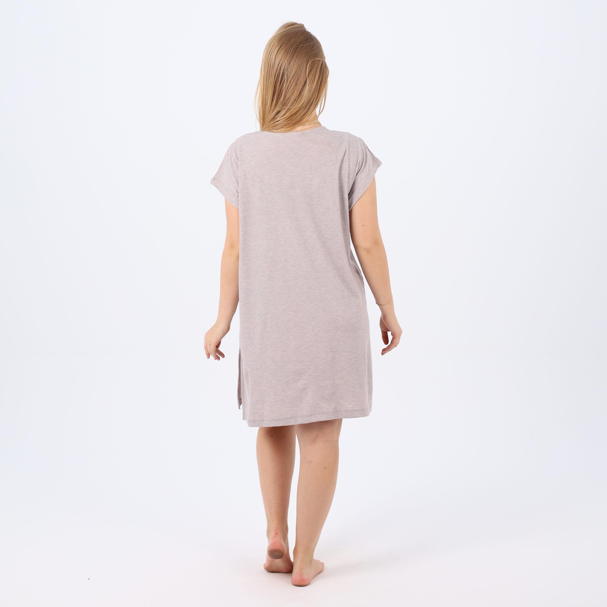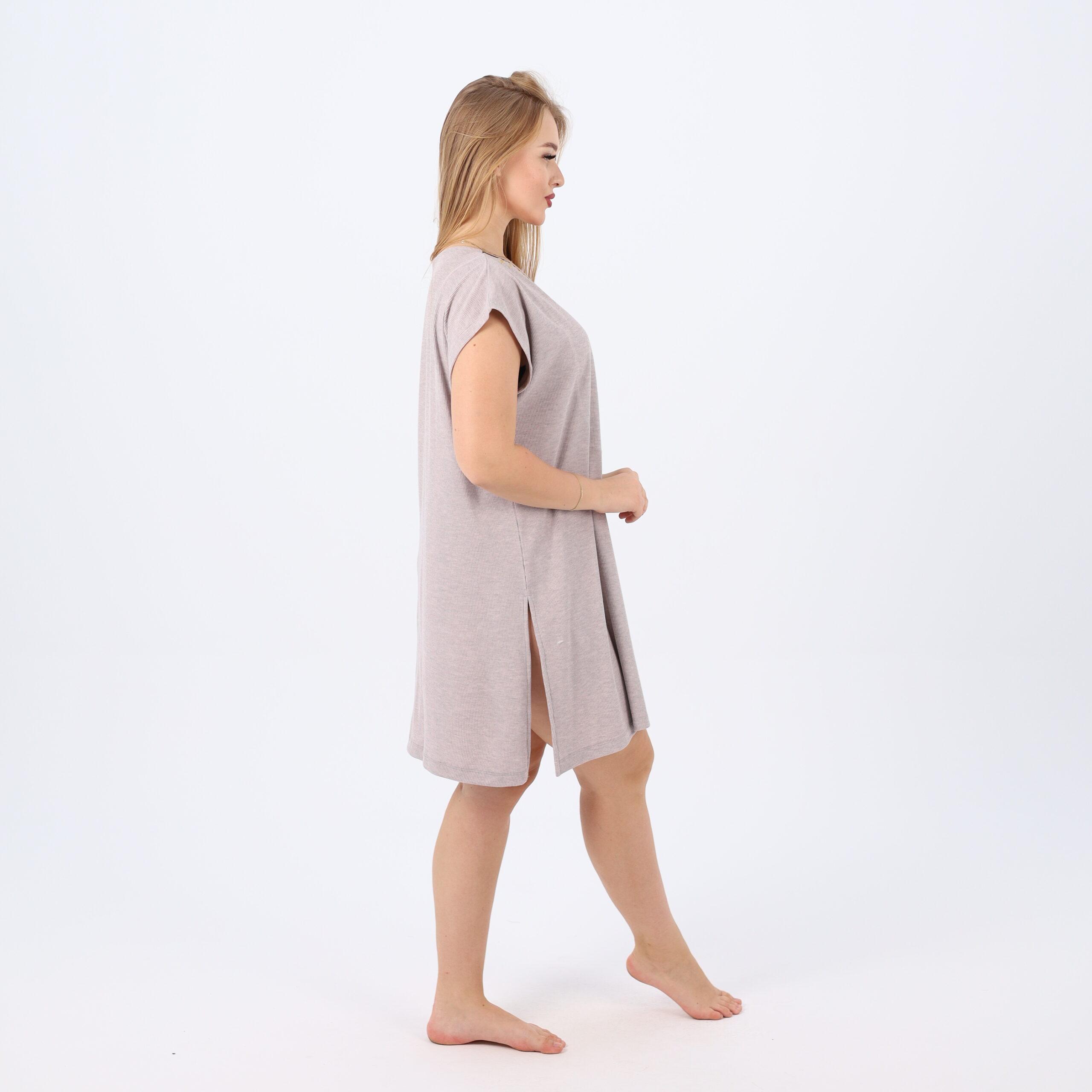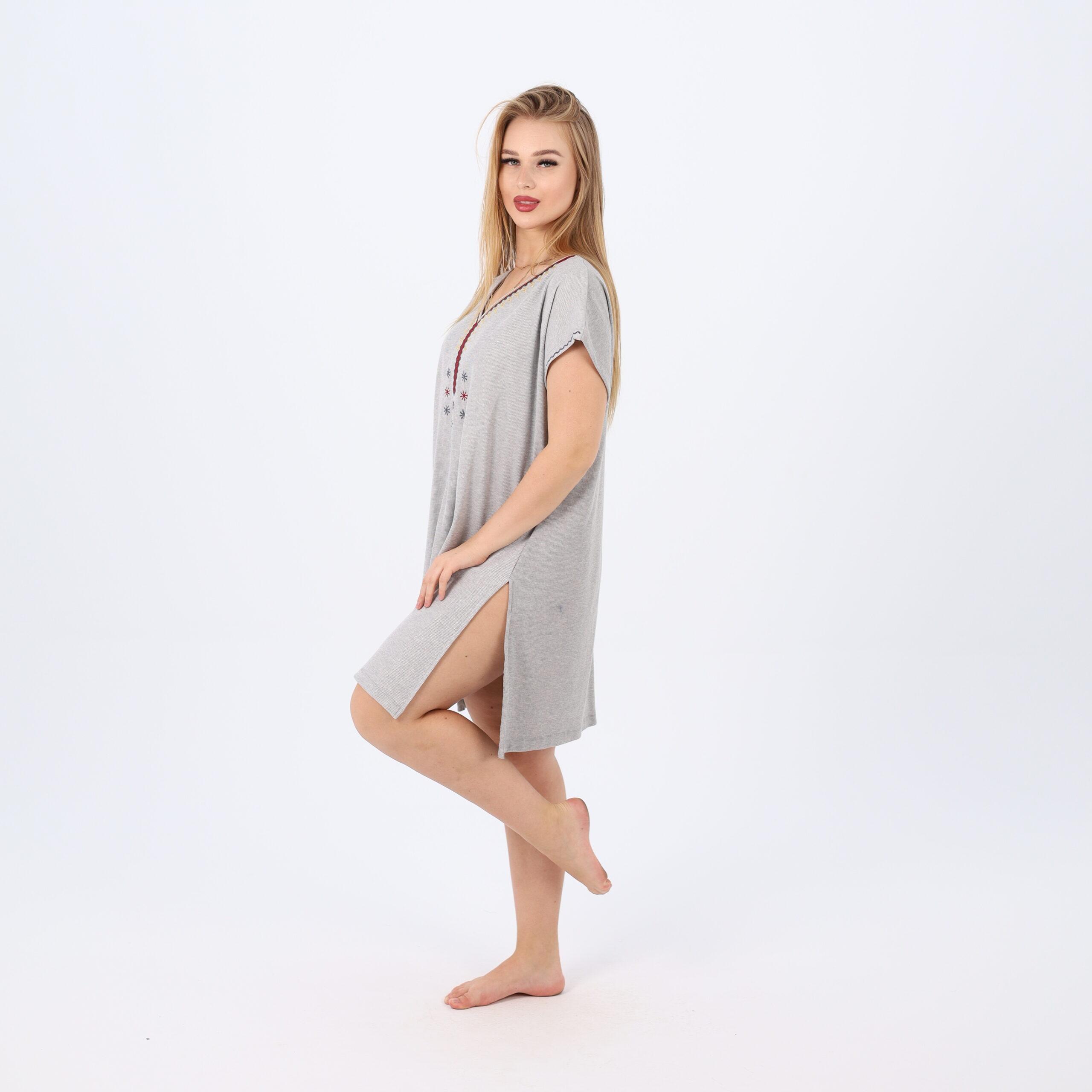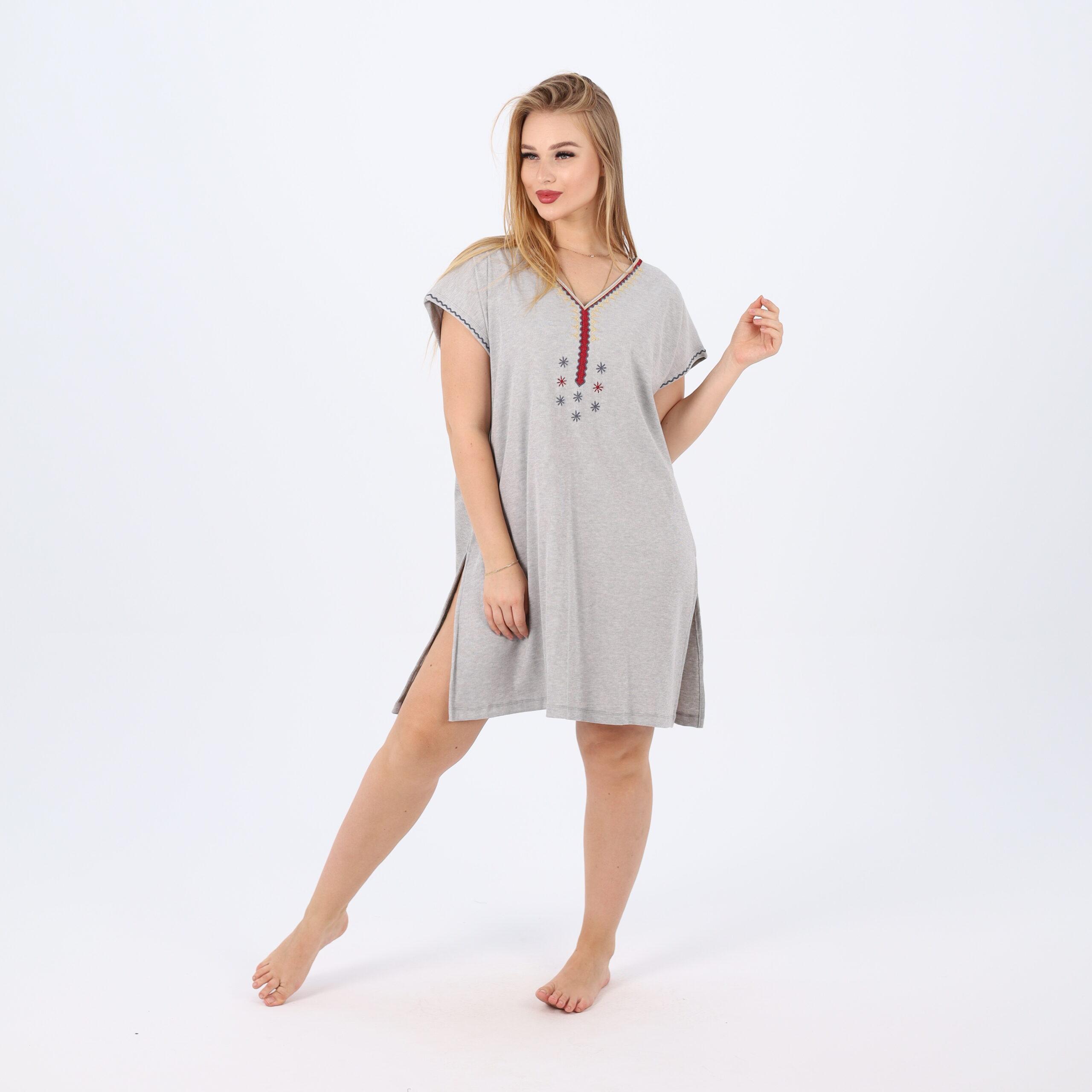 Sleep in style and comfort with this soft cotton nightdress, designed for cozy nights and relaxing evenings at home. Featuring a loose, flattering fit for all body types, this dress includes a feminine V-neckline accented with delicate embroidery on the chest. The breathable cotton fabric feels gentle on the skin, making it perfect for warm weather or indoor lounging.