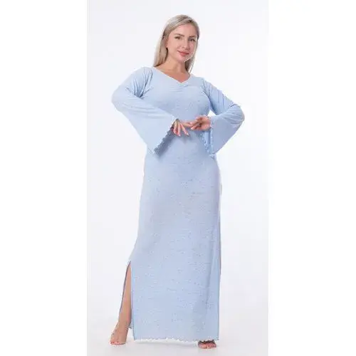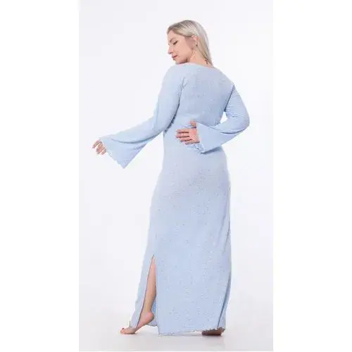 Enjoy comfort and elegance with this soft and lightweight nightgown, perfect for relaxing at home. It features a long design with a side slit and wide sleeves that add a feminine and modern touch. The light blue color adds a sense of calm and softness.