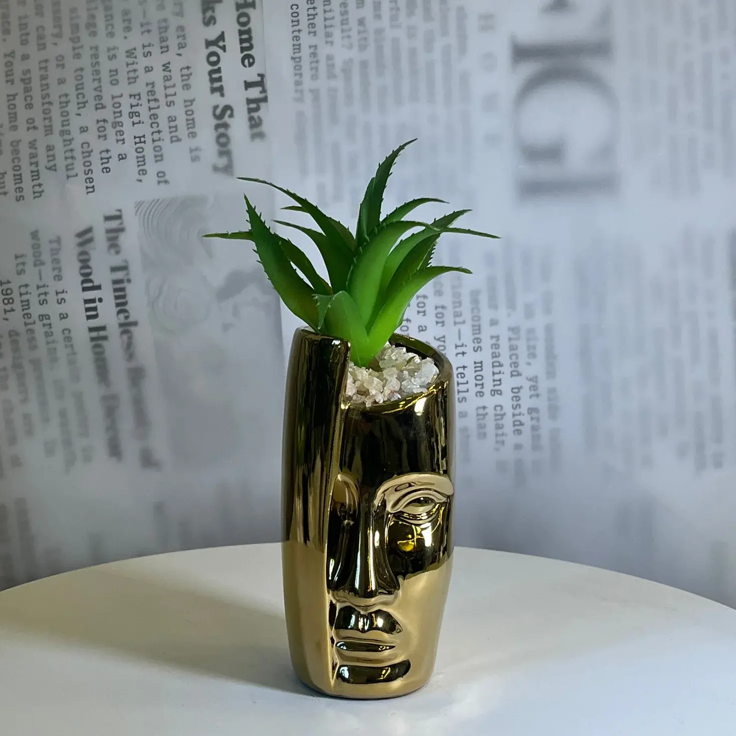 A striking sculptural planter featuring a minimalist face form with a high-gloss metallic finish. The smooth reflective surface contrasts beautifully with greenery, turning a simple plant into an expressive décor accent that adds personality and depth to any space.