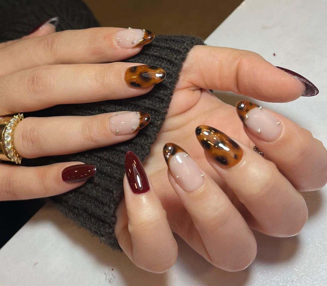 10Pcs Handmade Almond-Shaped Fake Nails With Burgundy and tiger design, Fashionable And Upscale Press On Nails Nail Supplies Nails