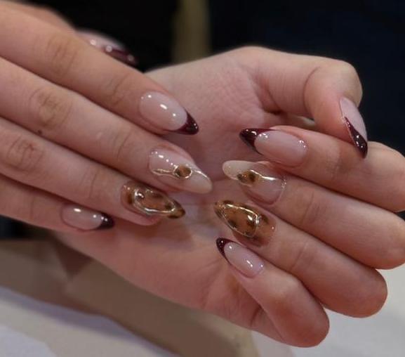 10Pcs Handmade Almond-Shaped Fake Nails With French burgundy & Shiny Gold Mirrored Powder & tiger, Fashionable And Upscale Press On Nails Nail Supplies Nails