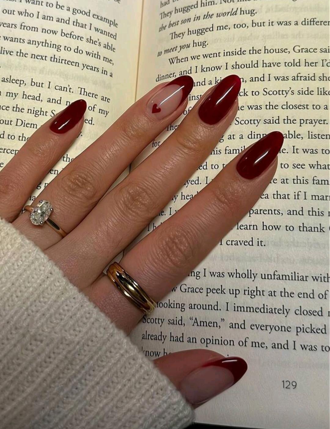 10 pcs Almond Shaped Nail Stickers Set, Romantic Red French Style With Heart Pattern - Glossy Finish, Includes 1pc Jelly Gel And 1pc Matte Strip, Suitable For Women's Party, Ball, Casual Wear And Valentine's Day, Adds Romantic Atmosphere. Removable And Reusable.