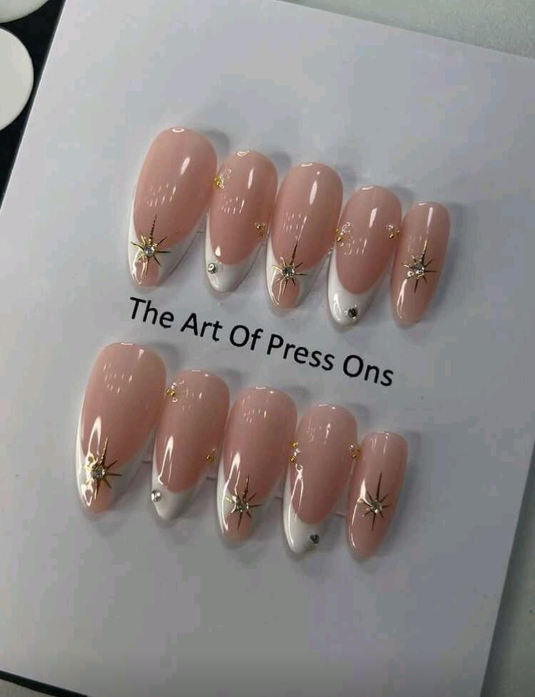 Gentle And Exquisite 10 Long Almond Shaped Press On Nails, Exquisite And High-End French Apricot Colored Wearable Nails Decorated With French Edges, Star Lights, Small Steel Balls, Pearls, And Rhinestones, Fully Detachable Fake Nail Set, Suitable For Office Workers, Students, Party Girls, And Nail Supplies Of All Seasons, Equipped With 1 Jelly Gel And 1 Nail File.