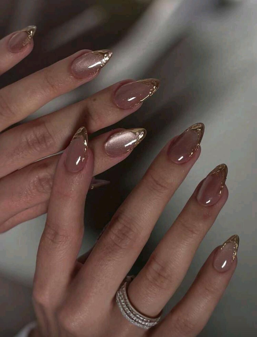 10pcs Handmade press on nails Pink Cat Eye French Manicure Nail Stickers, Almond Shape, Gold Line Decor, Minimalist Style, Smooth Surface, Full Coverage False Nails, Suitable For Women And Girls Daily Wear