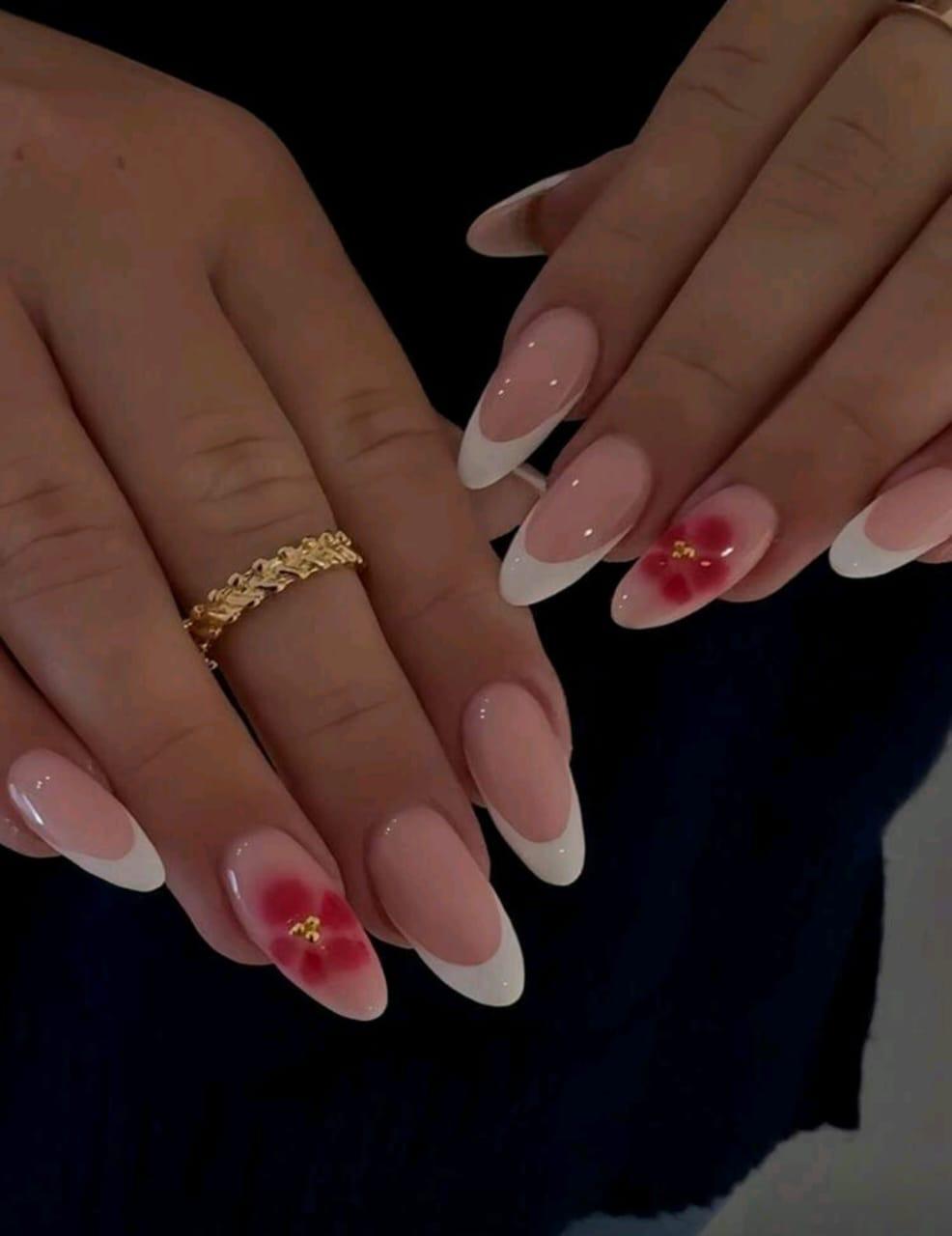 12 pcs Almond Flower Nail Stickers, French Pointed Design With Pearl Decor, Perfect Fit Acrylic Fake Nails Set, Includes: 1pc Jelly Gel And 1pc Nail File, Bloominggelnails French Tip Nail Stickers, Suitable For Women's Daily Work, Festivals And Parties