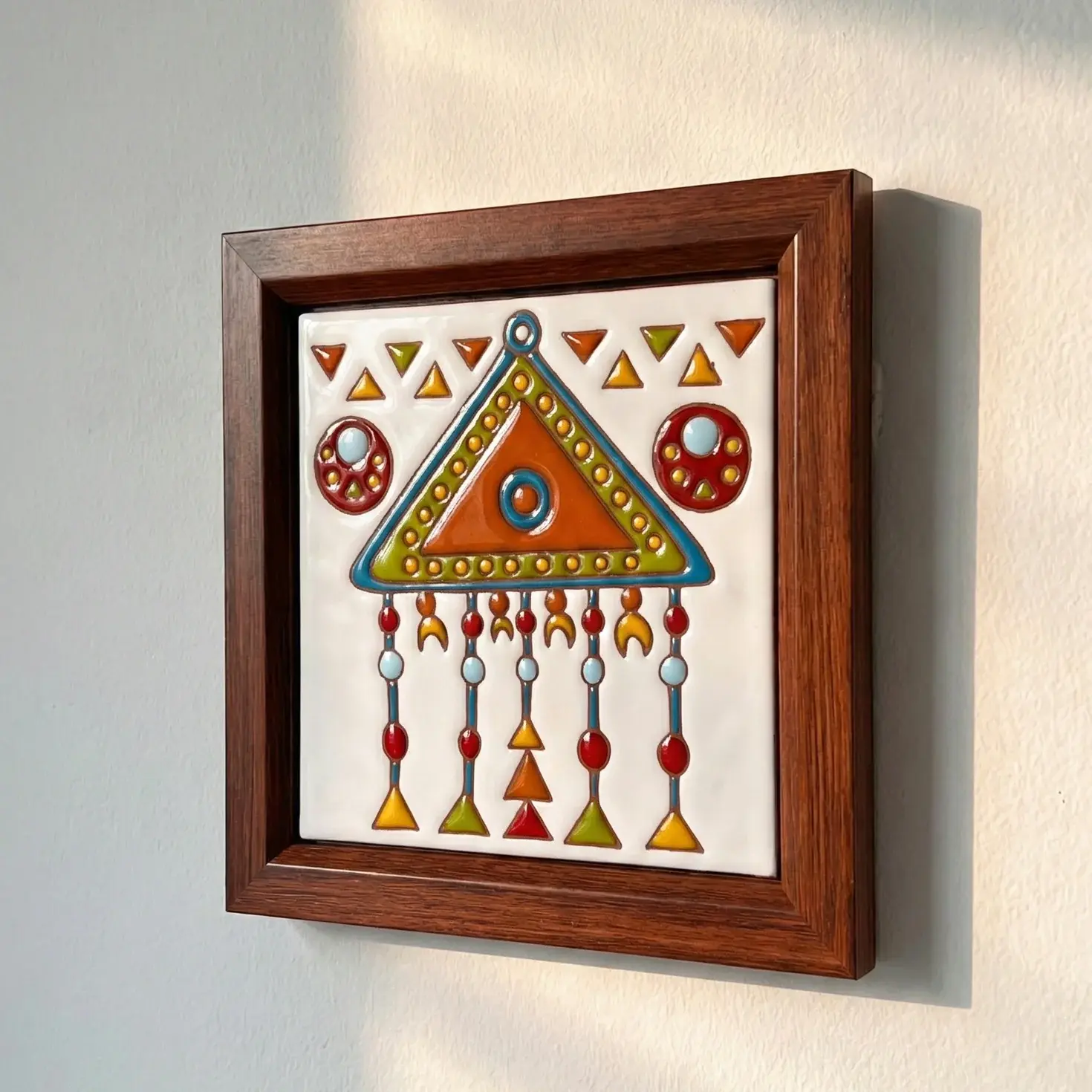 This hand-painted glazed ceramic artwork draws inspiration from traditional Nubian amulets and symbolic jewelry, featuring a central triangular form adorned with hanging geometric elements. Rich earth tones and vibrant accents reflect protection, harmony, and cultural storytelling rooted in Nubian heritage. Finished with a warm wooden frame, it adds depth and meaning to any space.