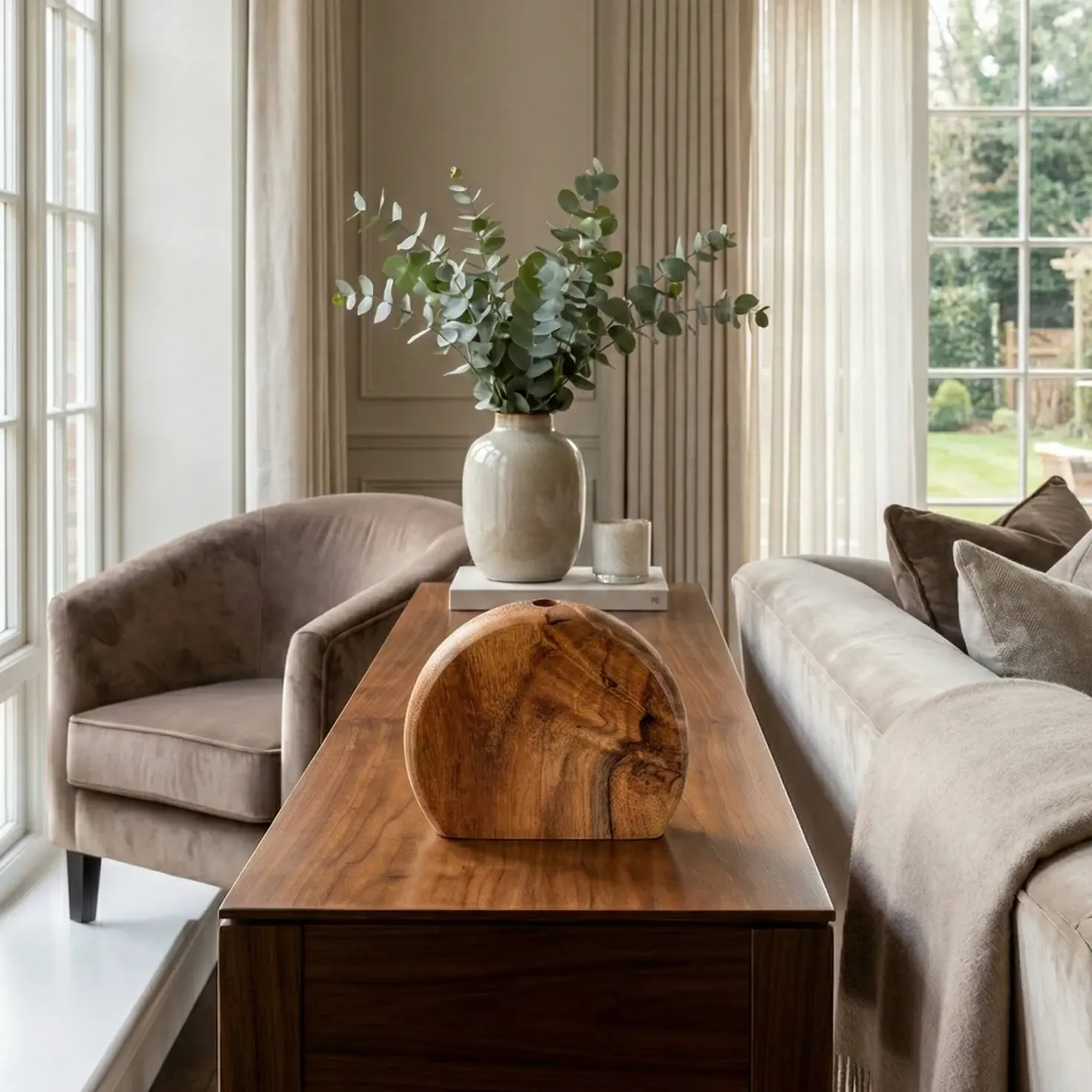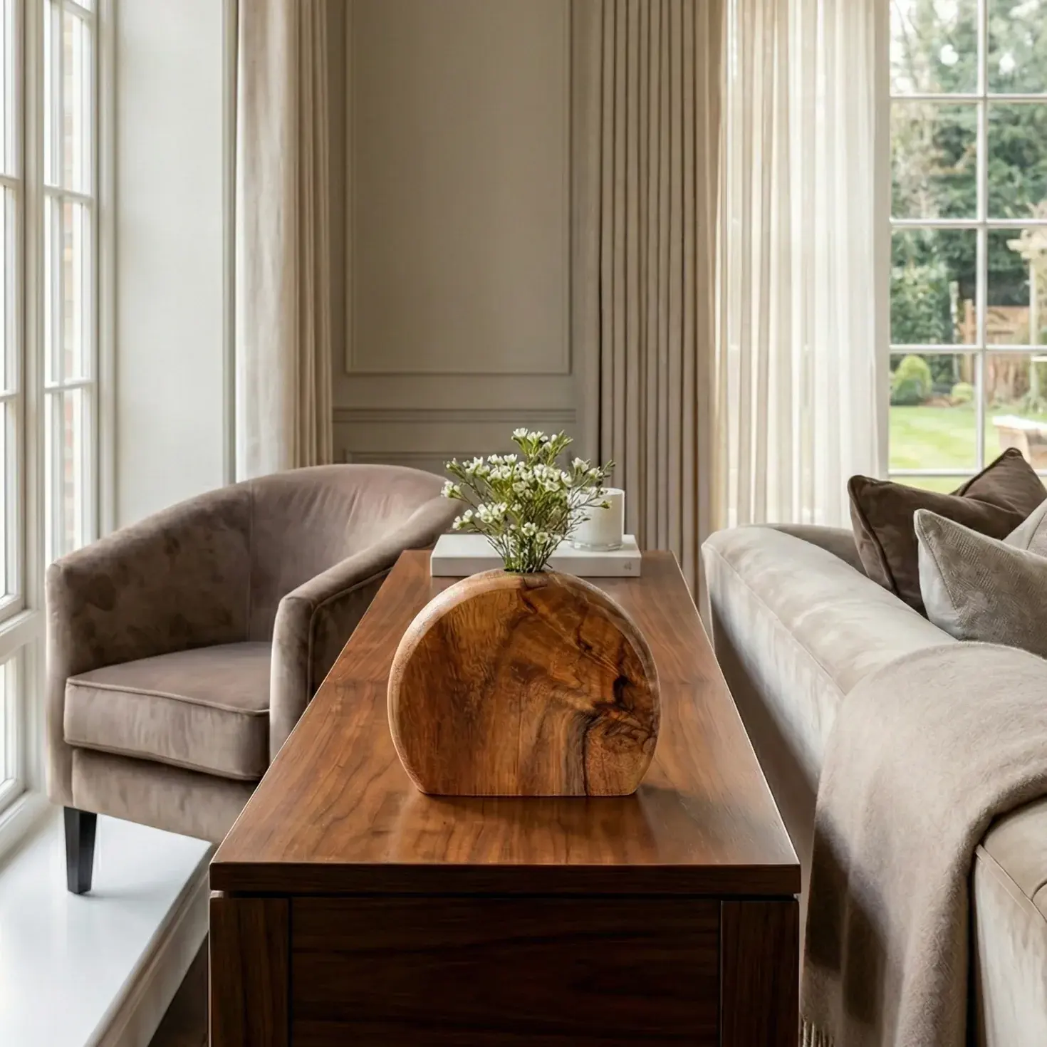 This rounded wooden holder is a simple, elegant accent piece designed for versatility. With a smooth natural finish and a clean drilled opening at the top, it can be used as a minimal bukhoor holder or as a small planter base for dried stems or mini arrangements. Its warm grain patterns and soft half-circle silhouette make it an easy styling piece for shelves, coffee tables, and entry spaces.