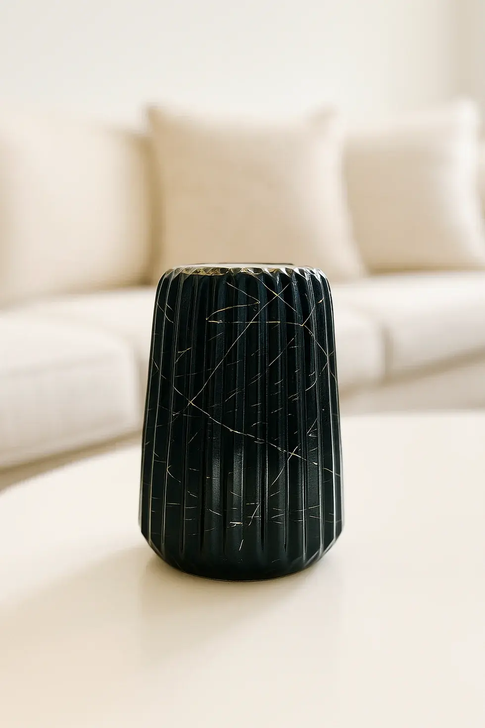 A contemporary statement piece crafted from durable fiber, designed to combine lightweight practicality with refined elegance. Its deep black body, enhanced by subtle golden veining, captures the sophistication of marble without the heaviness. The vertical ridged texture adds dimension and artistry, making it a versatile décor accent for modern and luxury-inspired spaces.