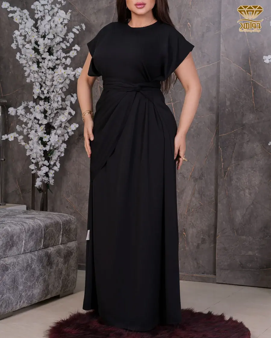 فستان أسود بربطة علي الوسط بقصة مميزة.