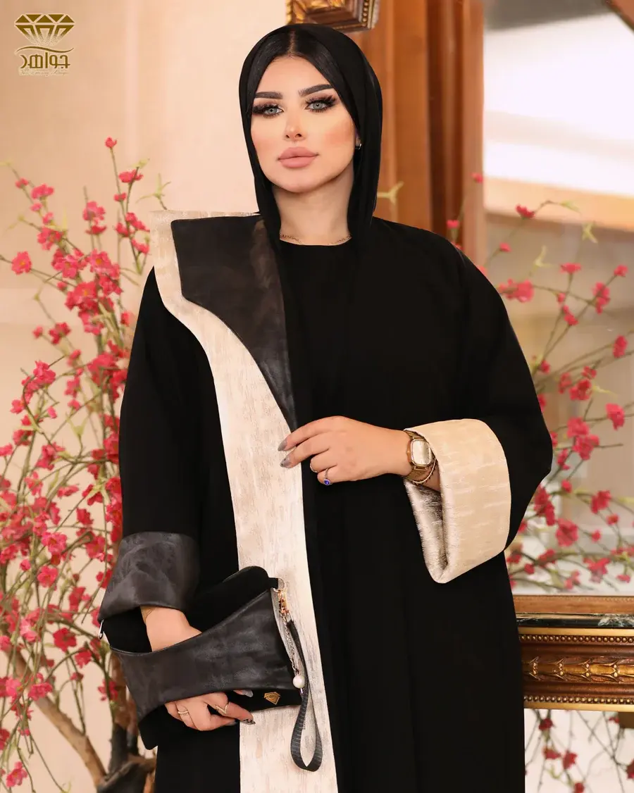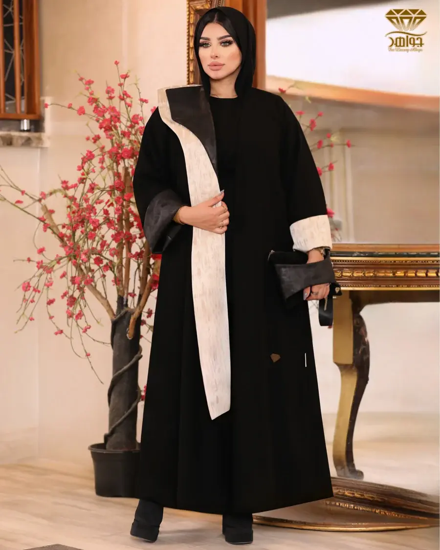عباية بتصميم مميز بخامة برلين مستورد، بإضافة لياقة وأكمام بخامة چاكار مستورد مع خامة بملمس ناعم Leather-look fabric والتي تتميز بنعومة ومظهر جلدي أنيق ولكن بملمس نسيجي ناعم.