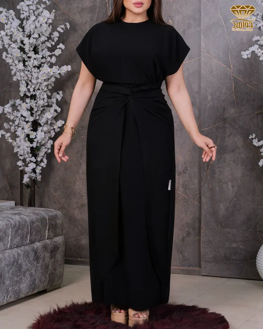 فستان أسود بربطة علي الوسط بقصة مميزة.