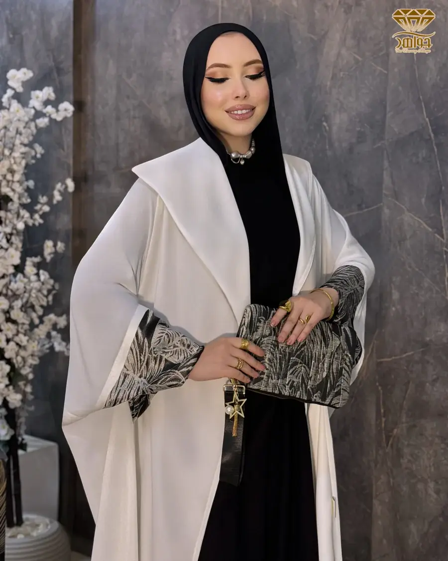 عباية بتصميم مميز بخامة برلين أبيض مستورد بإضافة أكمام بخامة فخمة چاكار مستورد.