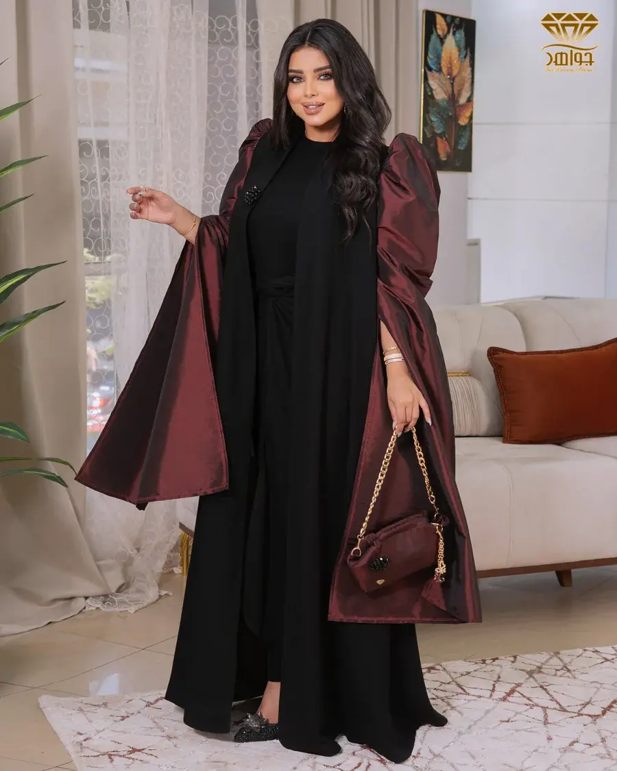 عباية بتصميم ملكي بخامة برلين مستورد مع أكمام بخامة شانتون مستورد بإضافة زرار كريستال أسود للتصميم.