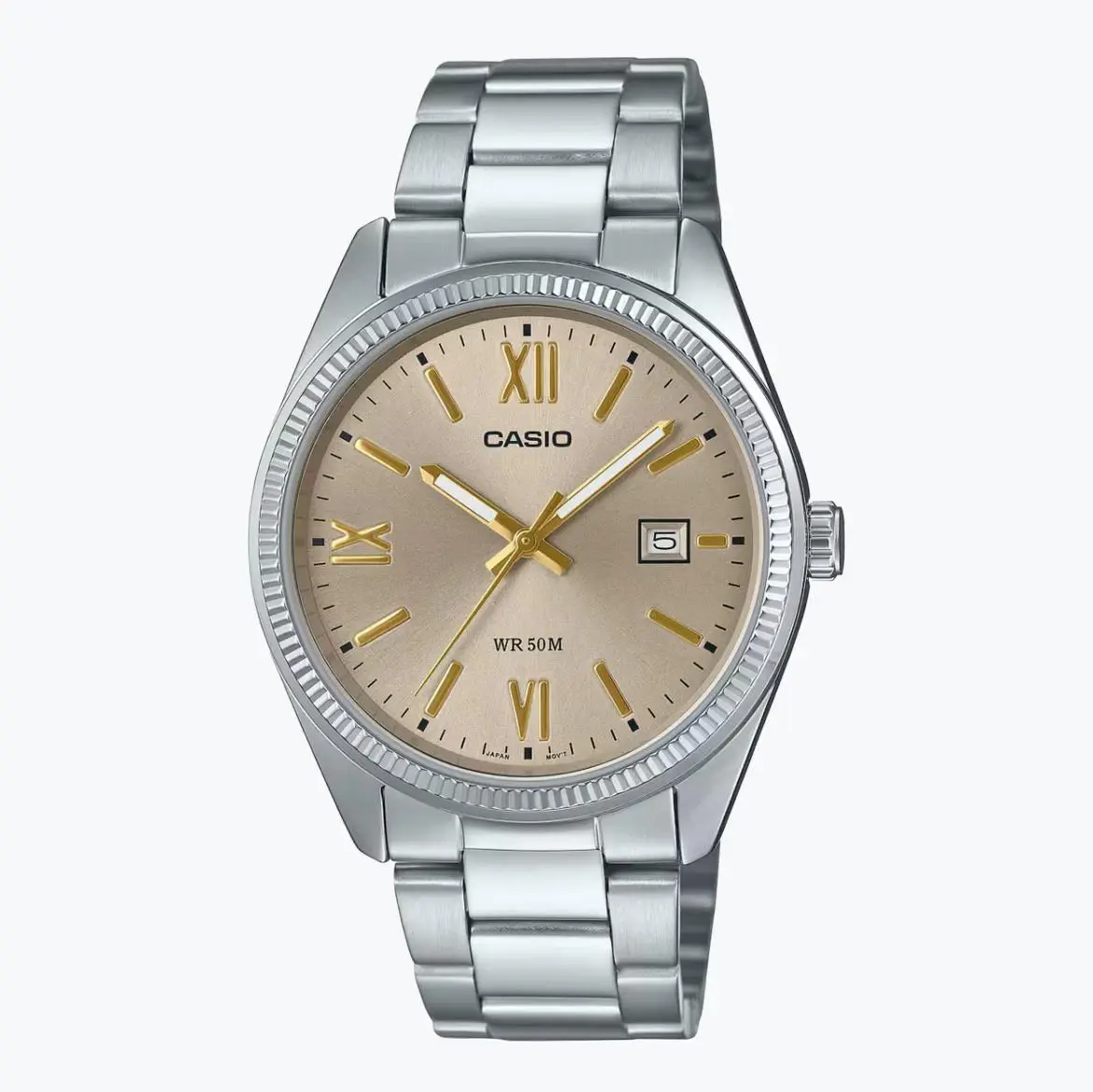 Band Material Stainless Steel Watch Movement Quartz Band Closure Clasp Face/Dial Type Analog Department Men Band Colour Silver Case Size/Diameter 40 mm Dial Colour Gold Face/Dial Shape Round Model Number MTP-1302DD-9AVDF Model Name Wrist Watch-45
