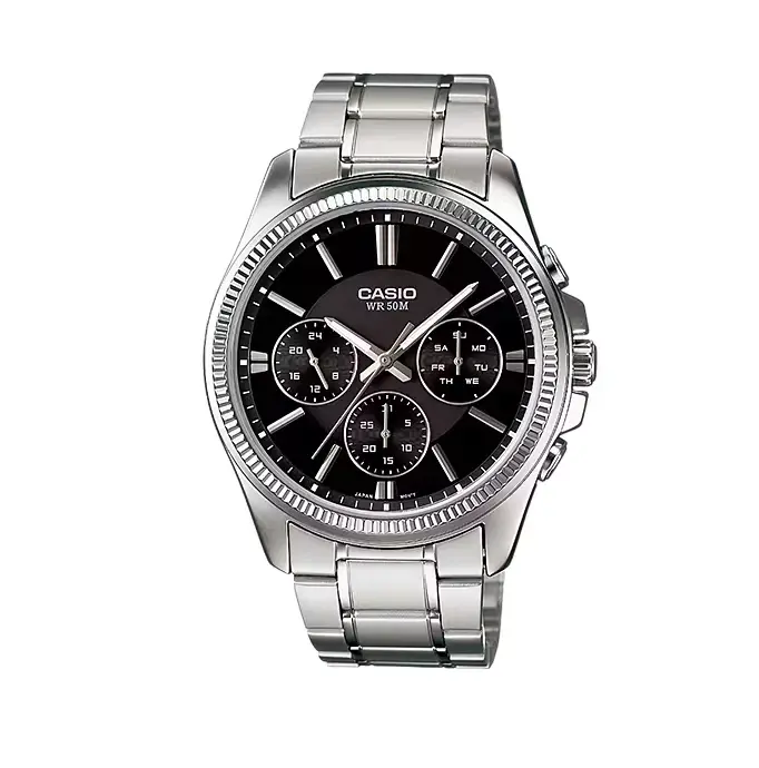 Display Type: Analog: 3 hands (hours, minutes, seconds), 3 sub-dials (date, day of the week, 24-hour format)