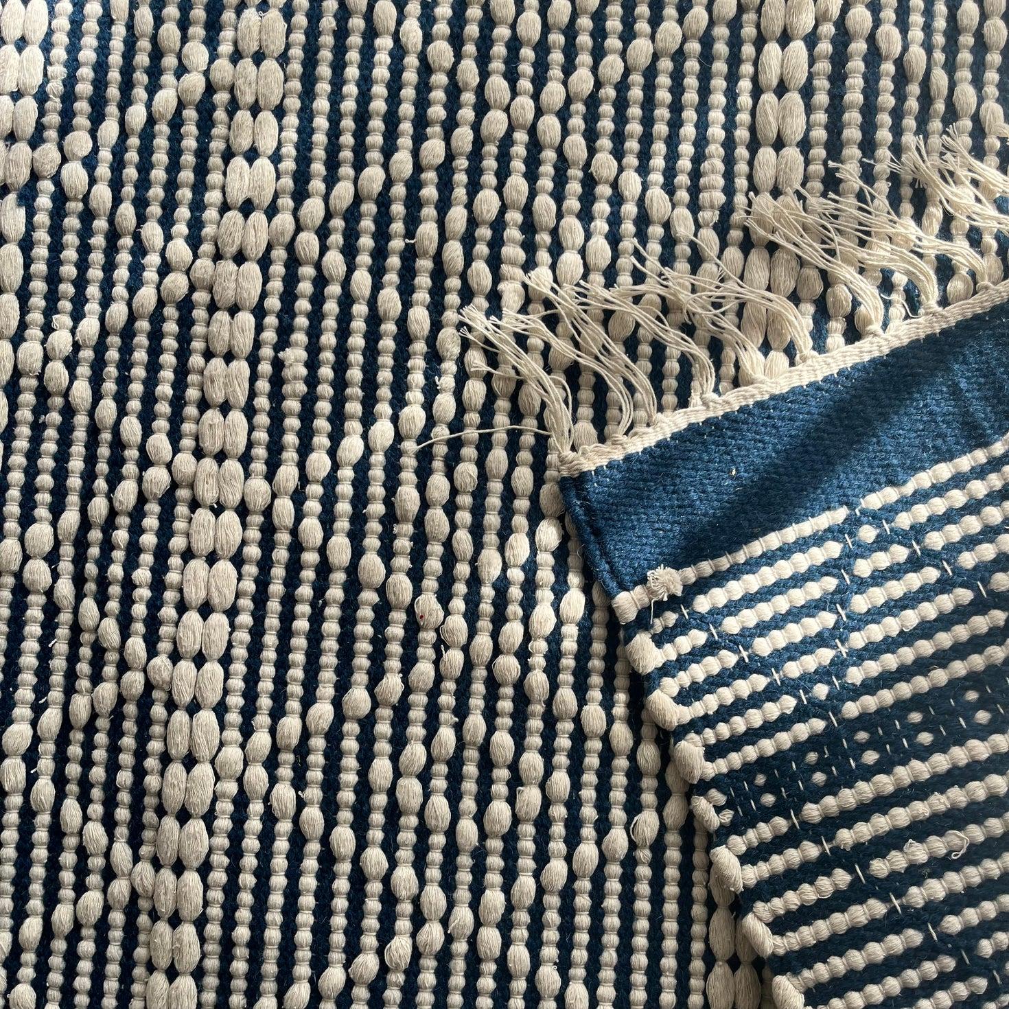 A beautifully woven cotton-blend kilim featuring classic geometric patterns in deep indigo and natural ivory tones. Finished with hand-tied fringes, this kilim adds warmth and texture to any space while maintaining a timeless, understated aesthetic. Ideal for layering or standalone use in modern and traditional interiors alike.