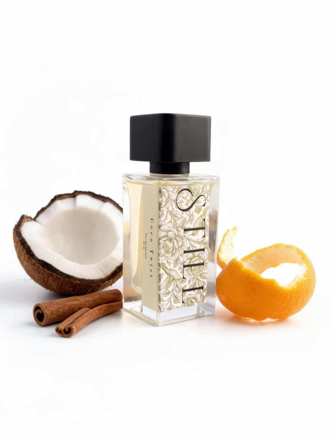لمسة جوز الهند البودريّة تتناغم مع الحمضيات المنعشة، وقاعدة خشب الصندل تمنح ثباتًا ودفء يدوم على البشرة