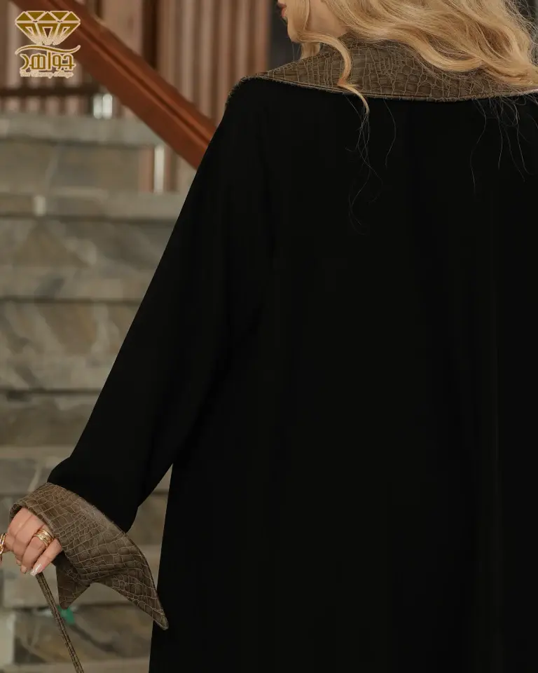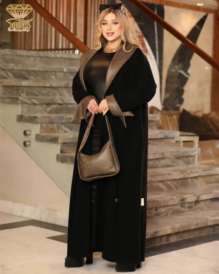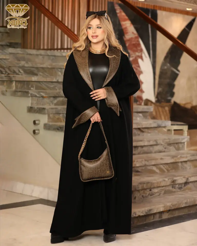 عباية أنيقة بتصميم Coat فاخر عصري مصنوعة من خامة برلين مستورد بإضافة بطانة داخلية ناعمة بالكامل للعباية، ومزودة بياقة وأكمام بنقشة Croc-embossed بملمس ناعم وفخم وهي خامة تشبه الجلد في الشكل فقط وليس الملمس.