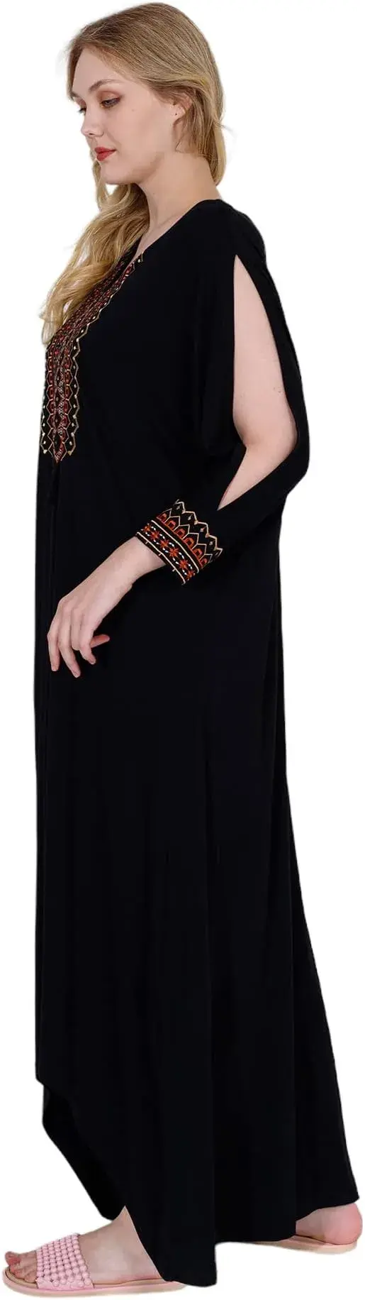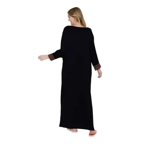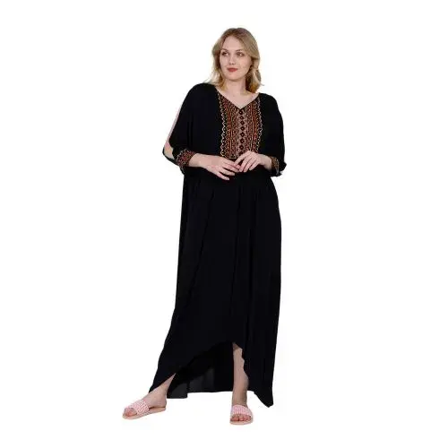 Step out in effortless style with this elegant black maxi dress, designed with beautiful ethnic-inspired embroidery along the neckline and sleeves. Featuring a relaxed fit, flowing silhouette, and soft breathable fabric, this dress combines comfort with sophistication. Perfect for casual outings, gatherings, or vacation wear, it’s a versatile piece that adds a touch of charm and elegance to your wardrobe.