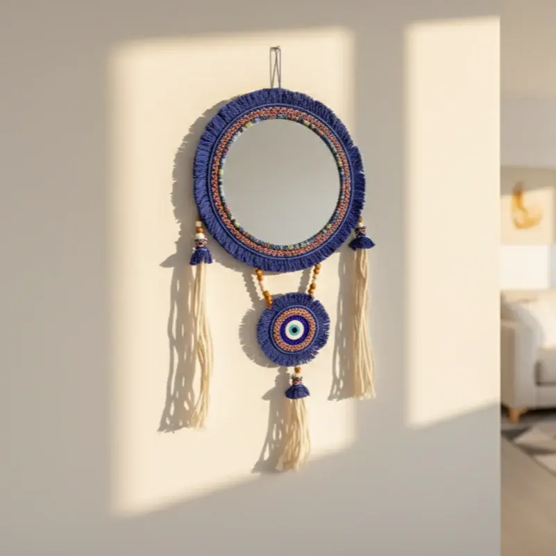 Material: Glass mirror with cotton macramé, wooden beads, and glass evil eye charm