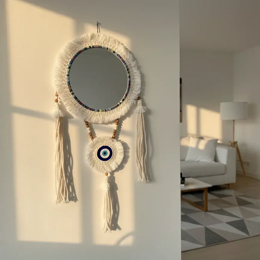 A handcrafted round mirror framed with soft macramé and detailed with wooden beads, tassels, and a central evil eye charm. Designed to combine protection and artistry, it brings both spiritual symbolism and bohemian elegance to any interior space.