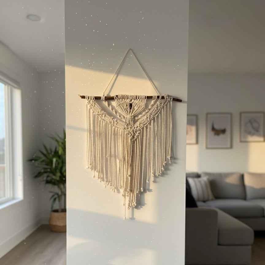 A beautifully handcrafted macramé wall décor piece made from natural cotton cords and suspended on a wooden rod. With its intricate knots and cascading fringe, it brings warmth, texture, and a relaxed bohemian charm to any modern living space.