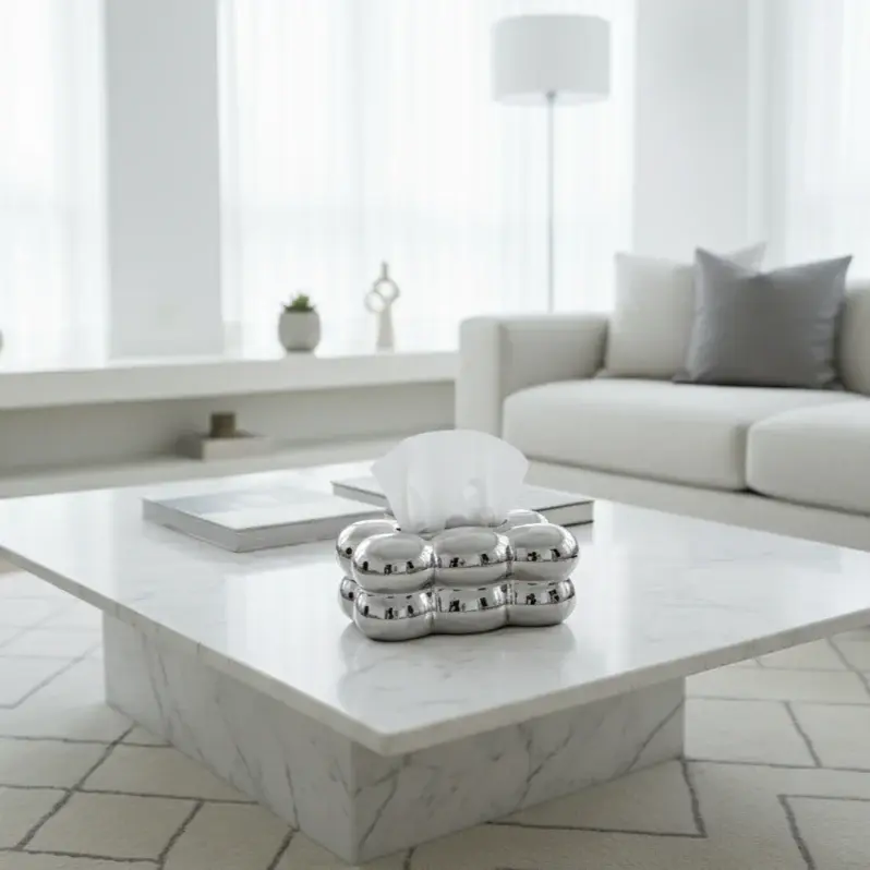 A contemporary tissue box holder with a sleek chrome finish and soft, cloud-like rounded design. Its reflective surface and sculptural form add a touch of modern luxury, making it a stylish centerpiece for coffee tables, consoles, or desks.