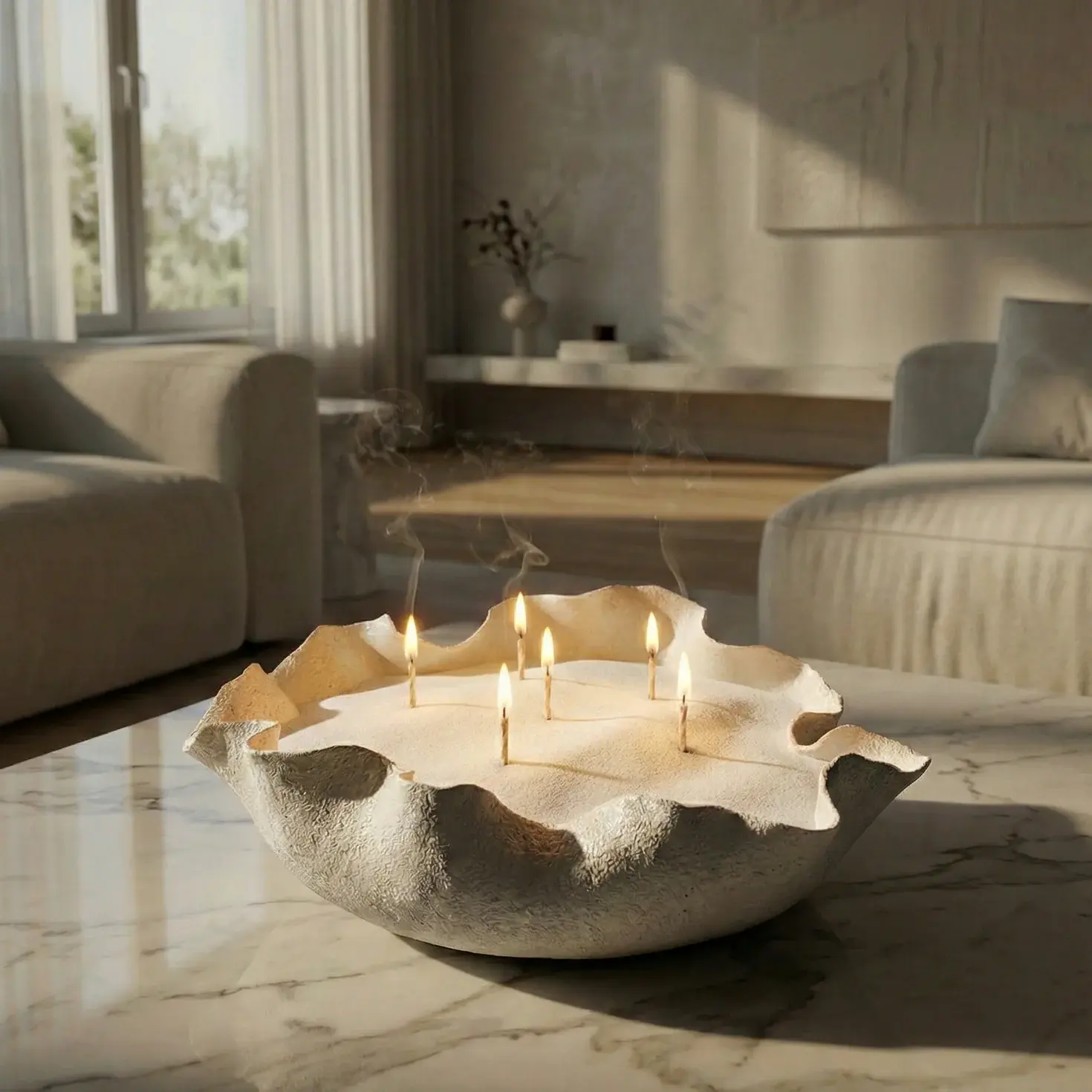 A handcrafted decorative bowl featuring an irregular, organic rim inspired by natural stone and flowing forms. Finished in a soft ivory tone with a subtly textured surface, this piece adds an artistic yet minimal touch to coffee tables, consoles, or dining settings.