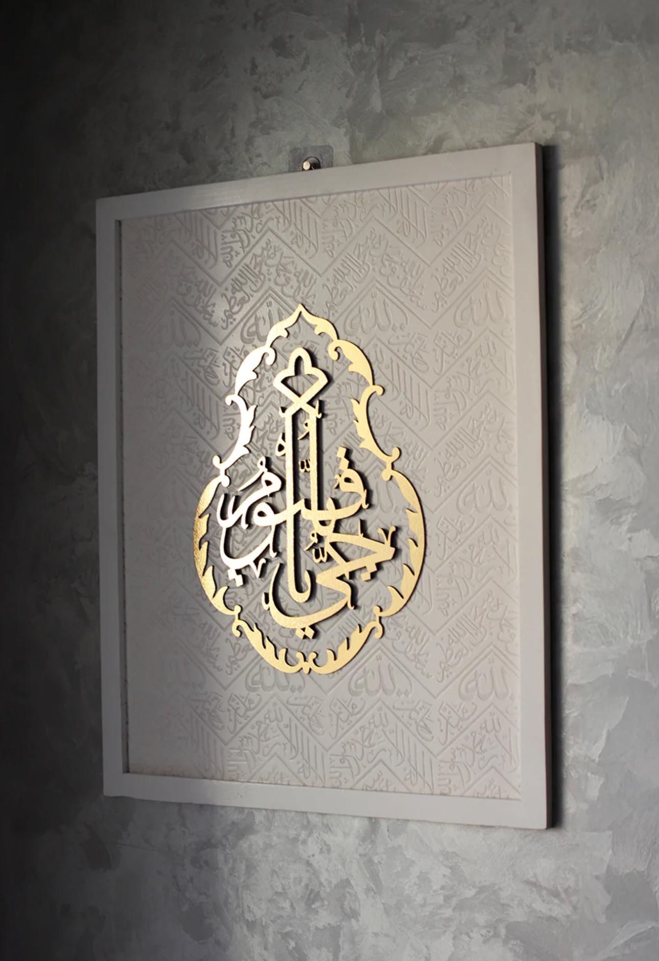 Each layer of premium black wood is laser-engraved with intricate Arabic calligraphy, creating a subtle depth that catches light beautifully.
