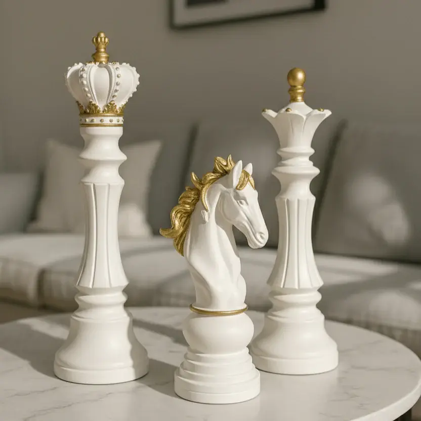 A commanding set of chess-inspired sculptures that merge strategy with sophistication. Featuring a stately King crowned in gold (38 cm), a graceful Queen with golden accents (35 cm), and a bold Knight with a striking gold mane (25 cm), this trio embodies elegance and strength. Their deep black finish contrasted with refined golden details makes them ideal statement pieces for modern interiors, whether displayed together or individually.