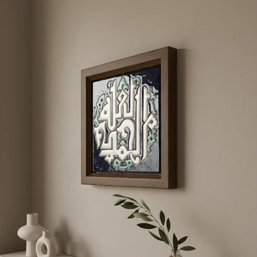 Gracefully crafted with traditional Arabic calligraphy, the Alhamdulillah Calligraphy Frame beautifully displays the sacred phrase “الحمد لله” — All praise is due to Allah. Each piece reflects timeless faith through its detailed ceramic work and intricate turquoise embellishments, framed elegantly in warm walnut wood. A perfect addition to bring serenity and gratitude into any home.