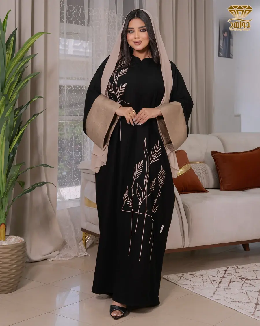 عباية مقفولة بخامة برلين مستورد مع أكمام بخامة چاكار مستورد، بإضافة تطريز ديجيتال بأجود أنواع الخيوط المستوردة.