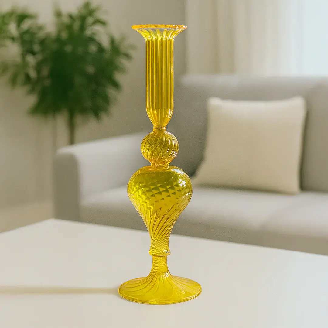 A sleek and modern candle holder, handmade from high-quality Pyrex glass. Available in two vibrant colors—yellow and red—perfect for adding a stylish pop to your decor.