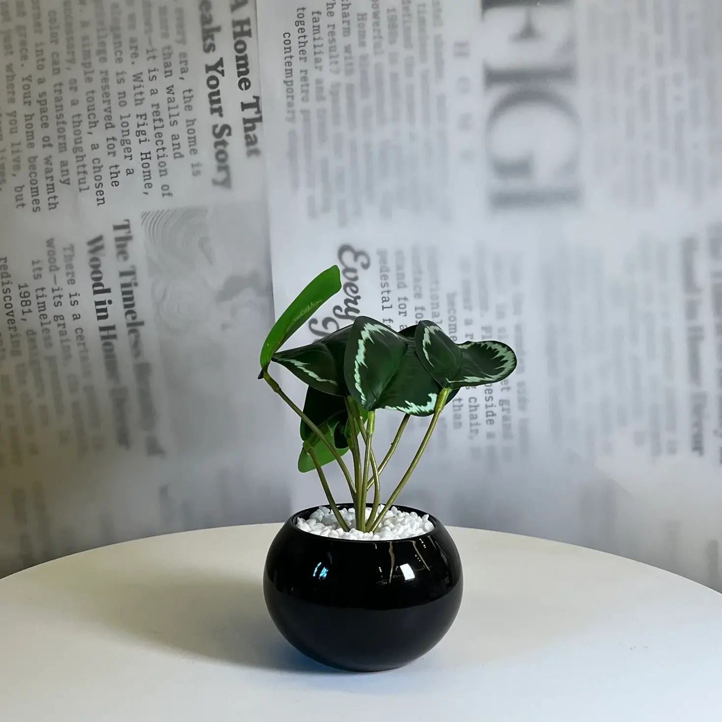 A sleek decorative planter featuring a deep black ceramic pot paired with a realistic artificial leafy plant. The glossy finish and compact rounded form give it a modern, elegant presence that works effortlessly as a subtle accent in contemporary interiors.