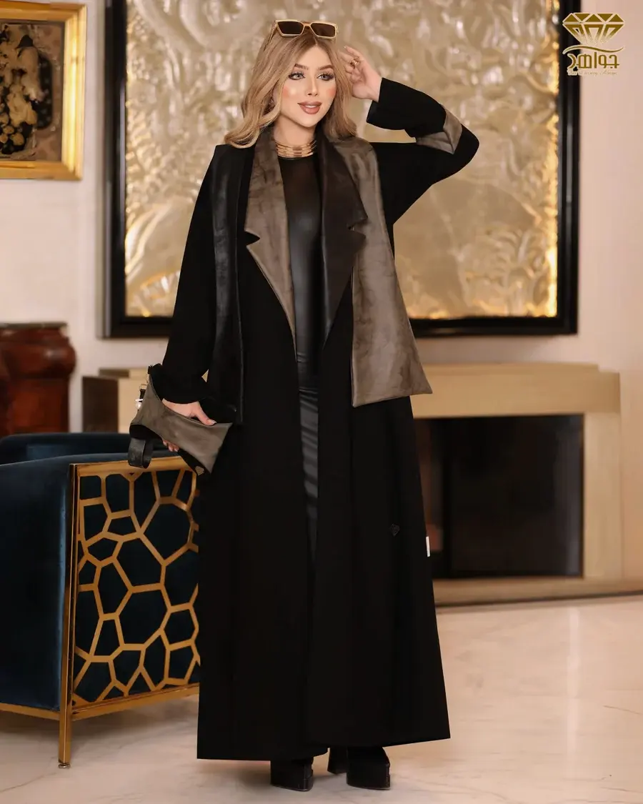 عباية بتصميم Coat عصري بخامة برلين مستورد، بإضافة لياقة وأكمام بخامة بملمس ناعم Leather-look fabric والتي تتميز بمظهر جلدي أنيق ولكن بملمس نسيجي مميز، و الـ Coat مزود ببطانة داخلية ناعمة بالكامل تعطي أناقة وثبات للتصميم.