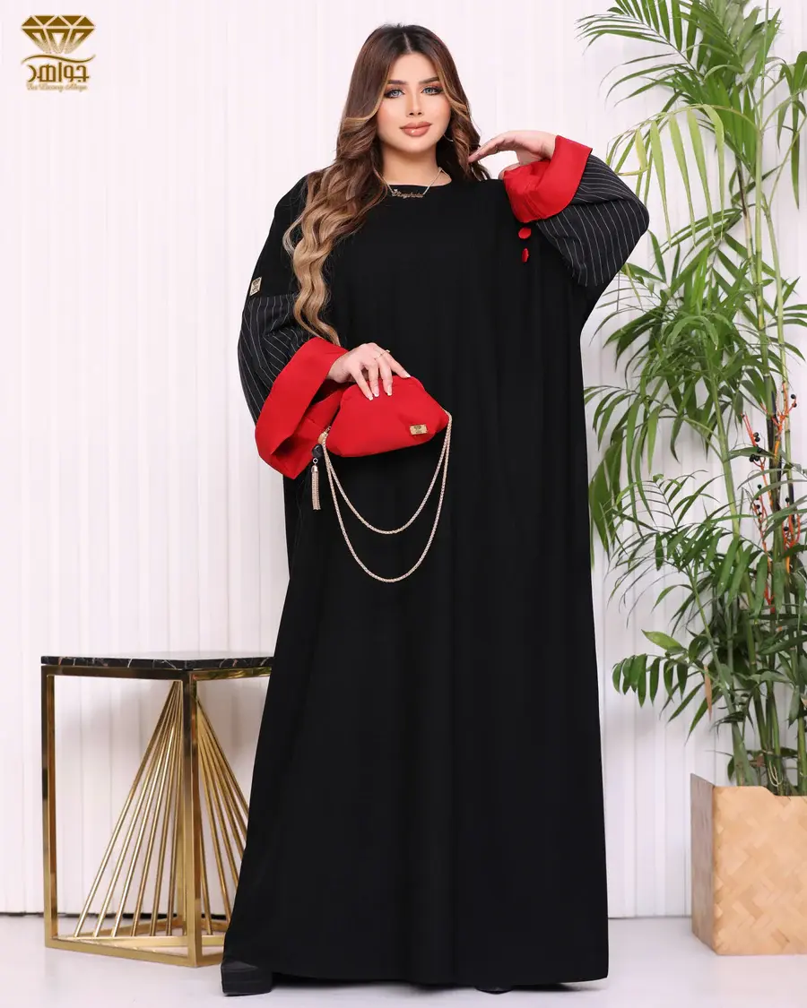 عباية مقفولة بتصميم مميز بخامة برلين مستورد، بإضافة قلبة كم بخامة چاكار مستورد وإضافة زراير بنفس الخامة للتصميم.