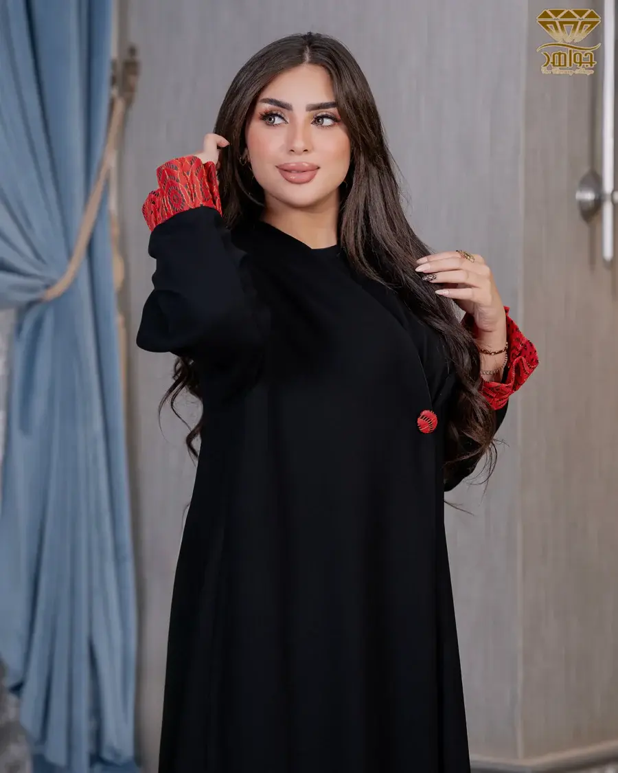 عباية بتصميم Simple مصنوعة بخامة برلين مستورد، مع إضافة كم وزرار من خامة شبك ملون، والزرار مزود بكبسونة للتحكم في فتح وغلق العباية.