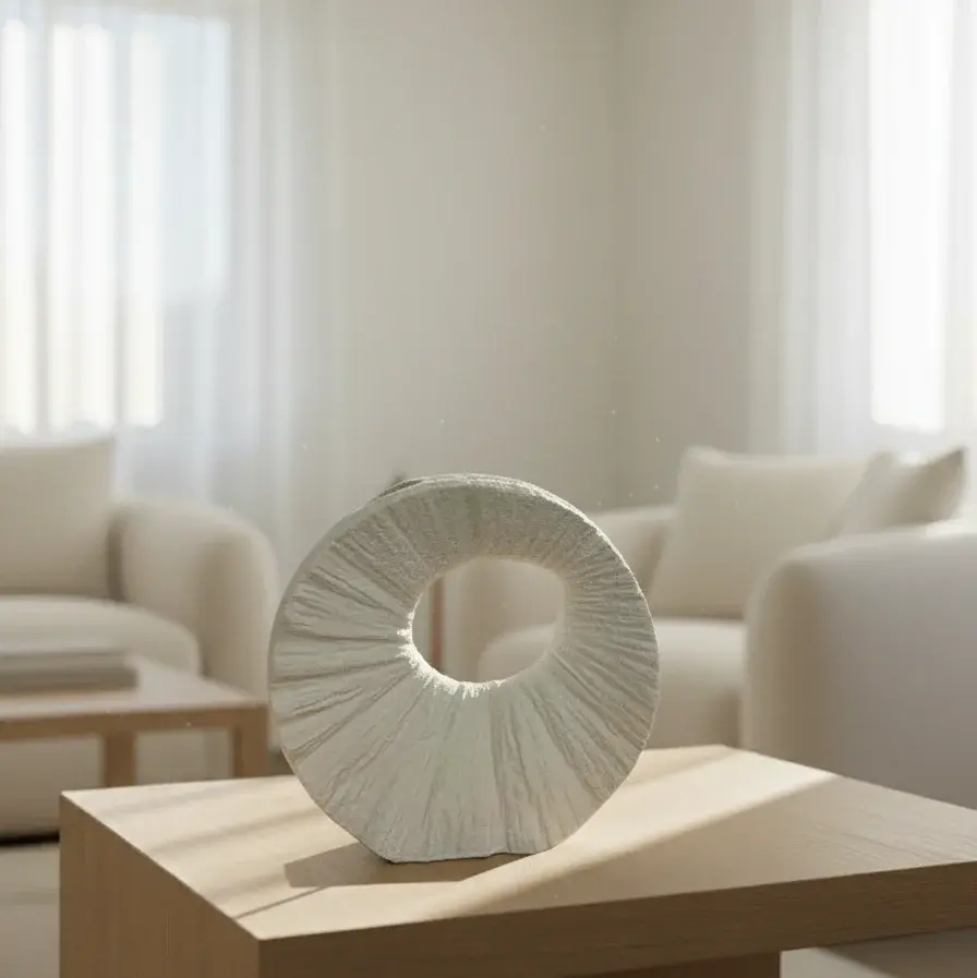 A contemporary ring-shaped sculpture with a textured, fabric-like surface that radiates a sense of movement and depth. Its organic circular form symbolizes unity and balance, making it a versatile centerpiece for consoles, coffee tables, or shelves.