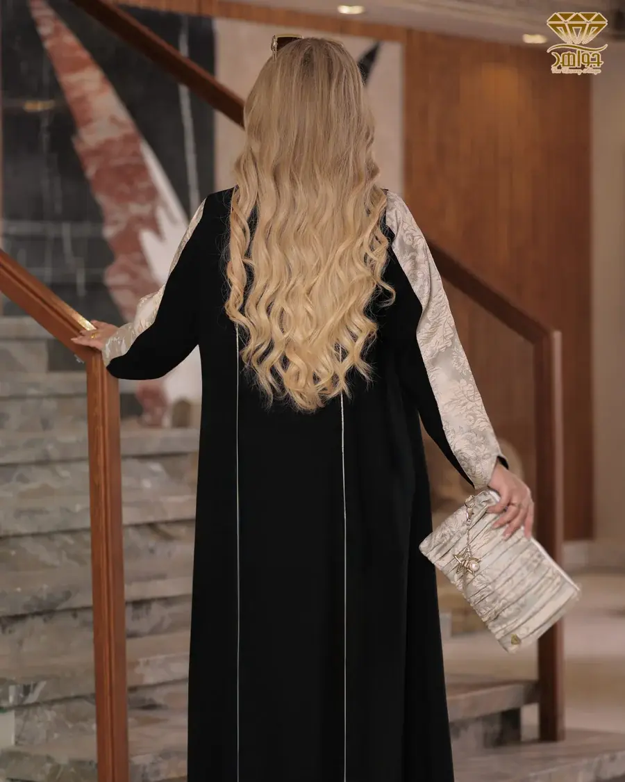 عباية بتصميم ملكي مختلف وفخم مصنوعة من خامة برلين مستورد، بإضافة أكمام وبيه أمامي وخلفي بخامة من الجاكار المنقوش المستورد.