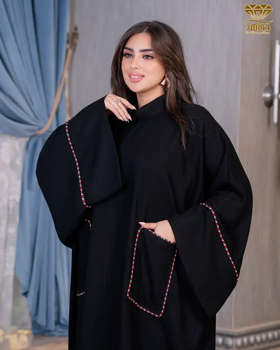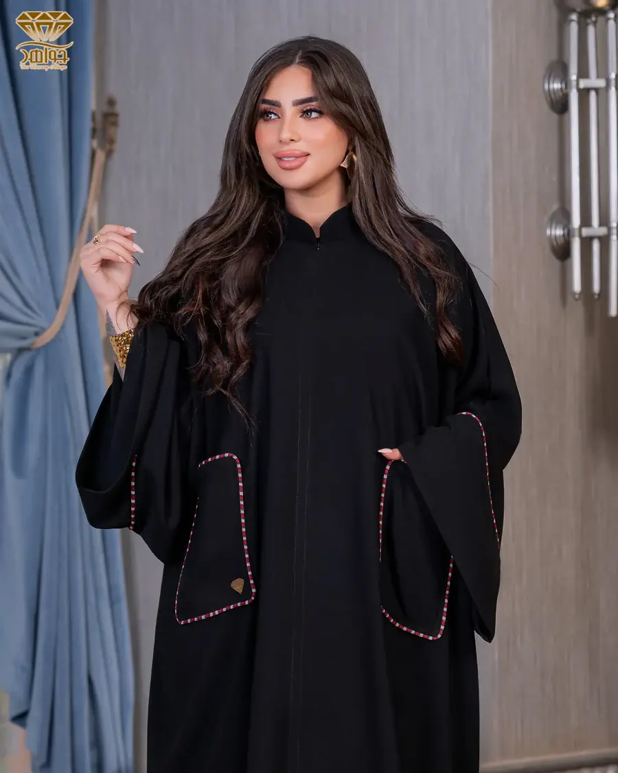 عباية مقفولة مصنوعة من خامة برلين مستورد بإضافة بييه بالأكمام والجيوب من خامة چاكار مستورد.