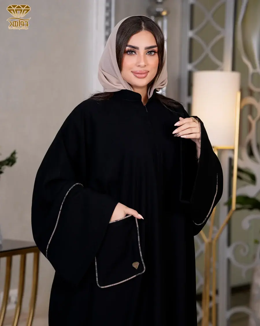 عبايةمقفولة مصنوعة من خامة برلين مستورد بإضافة بييه للأكمام والجيب من خامة چاكار.