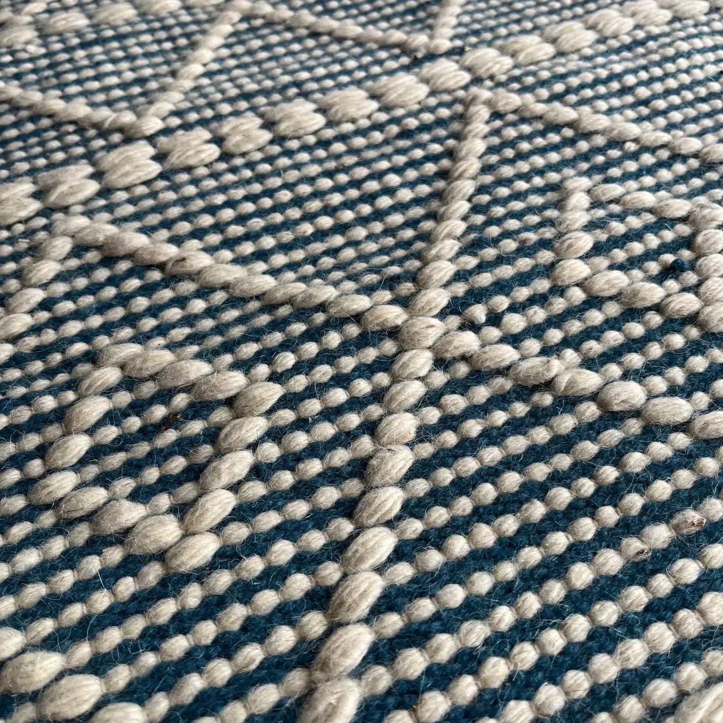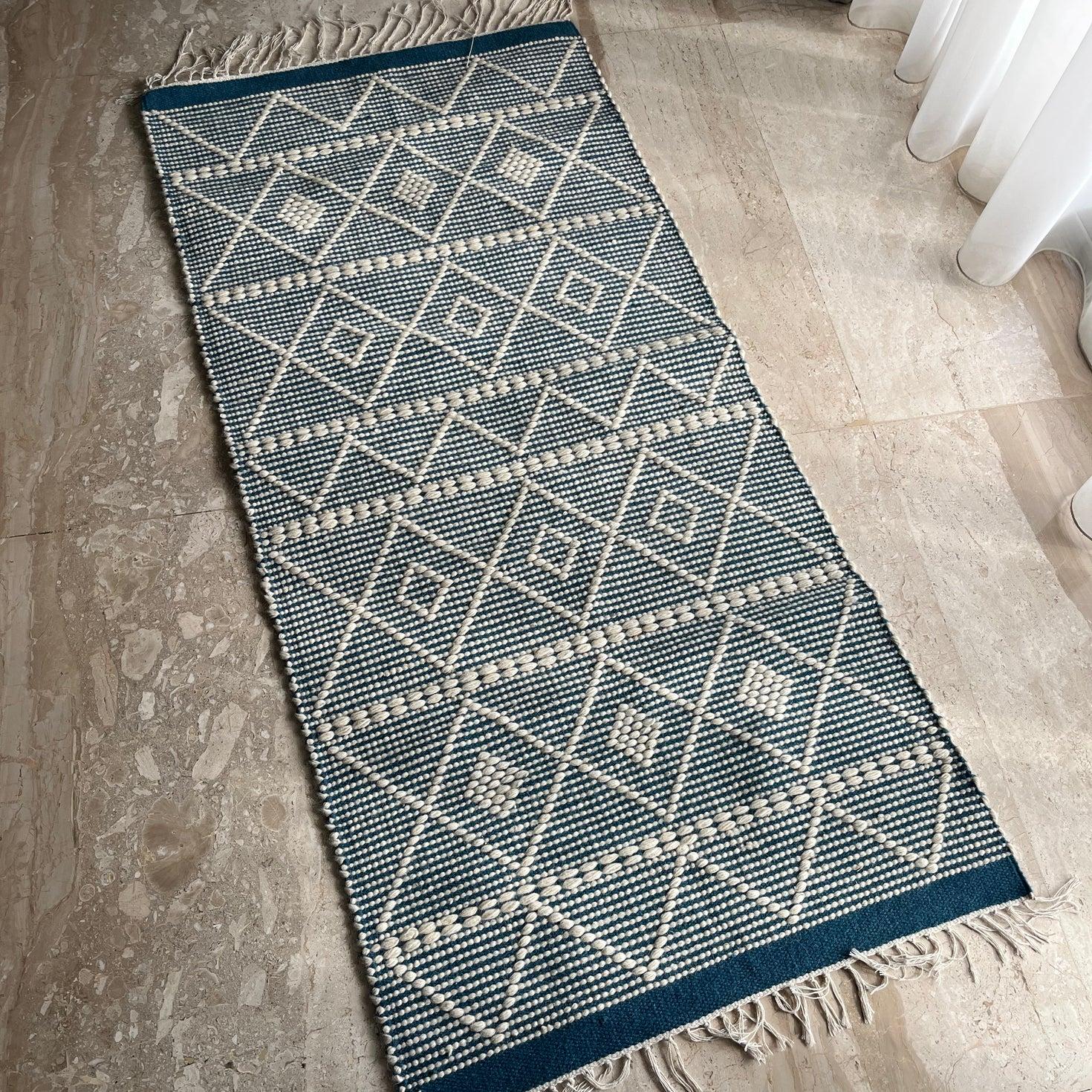 This kilim adds a soft, stylish touch to any room. It features a teal base with simple cream diamond patterns and light fringe on both ends. The weave is durable yet comfortable, making it great for hallways, bedrooms, kitchens, or small living areas. Its calm colors and clean design help brighten and warm up the space without being too bold.