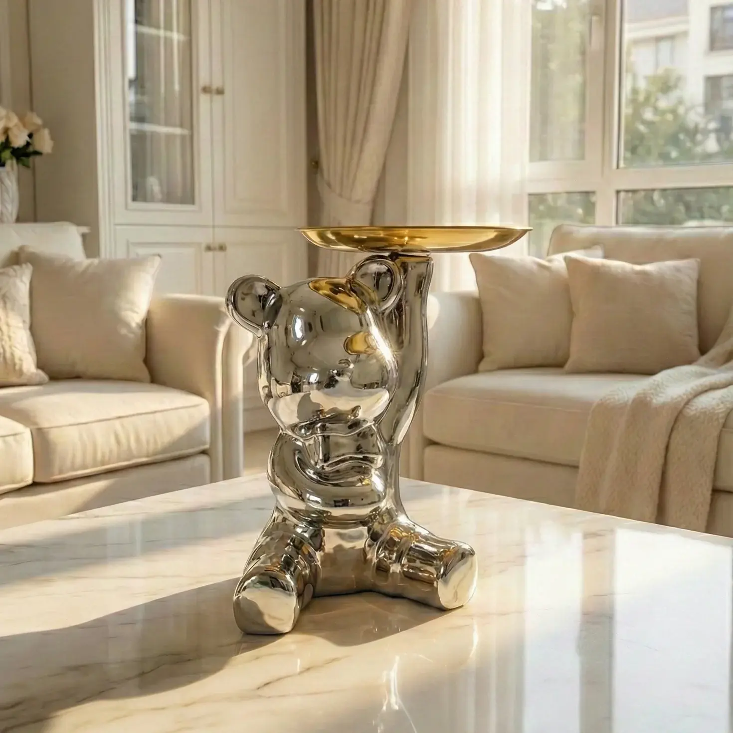 Decorative teddy bear holding a round tray. Can be used to hold jewelry, keys, or small items.